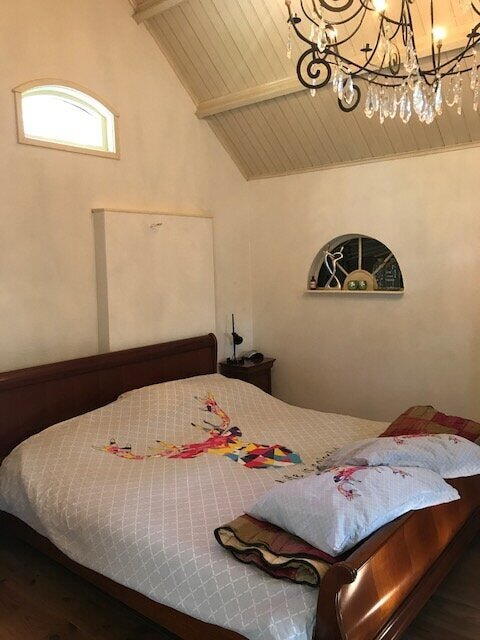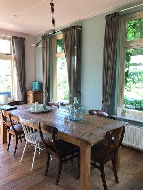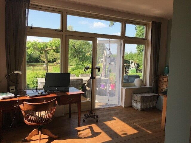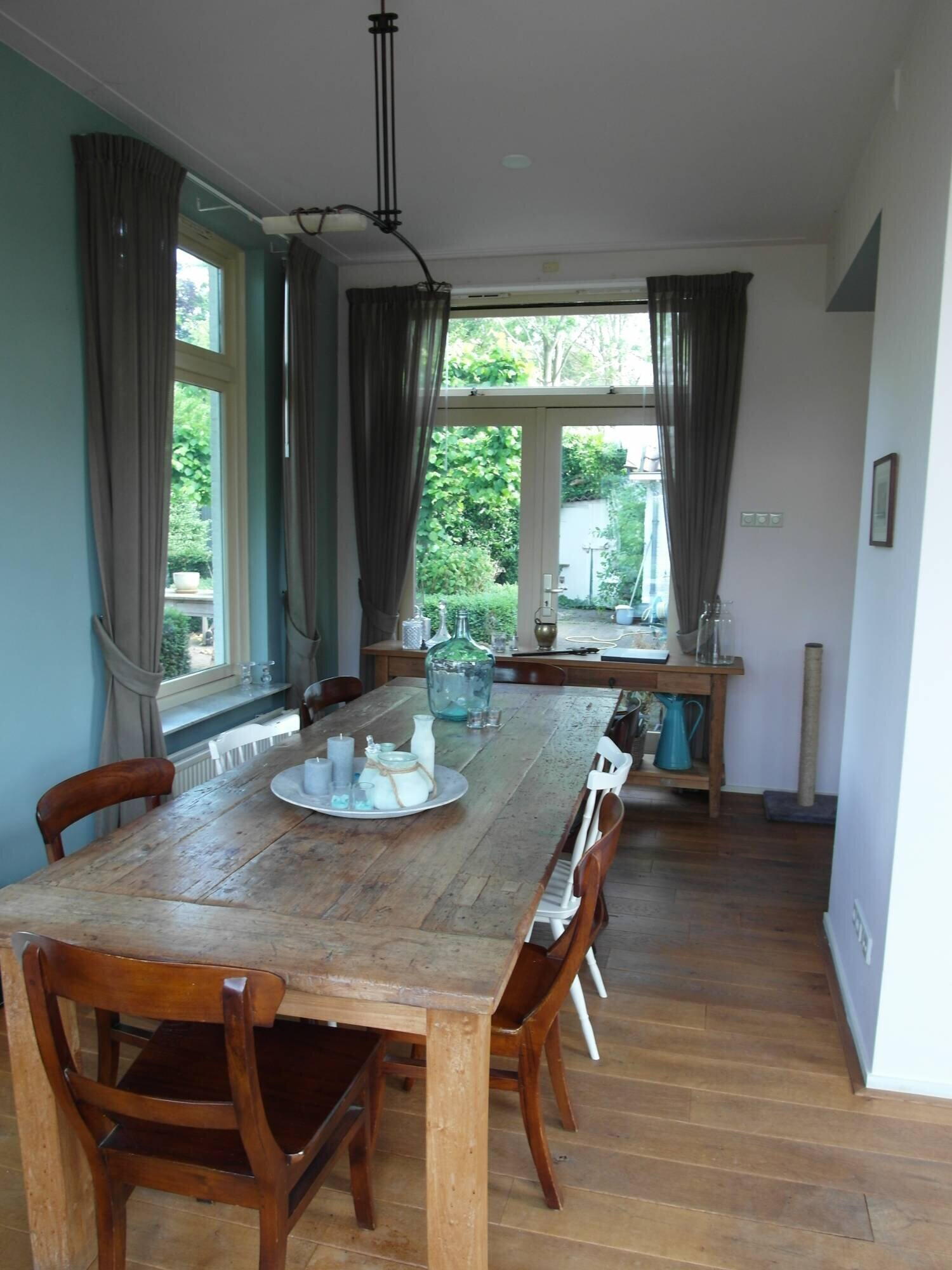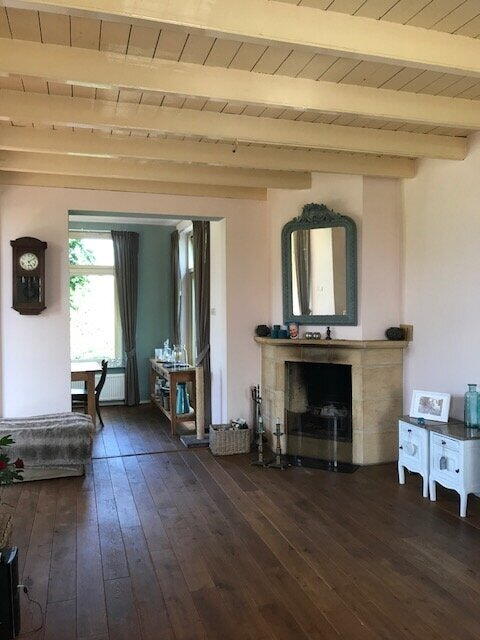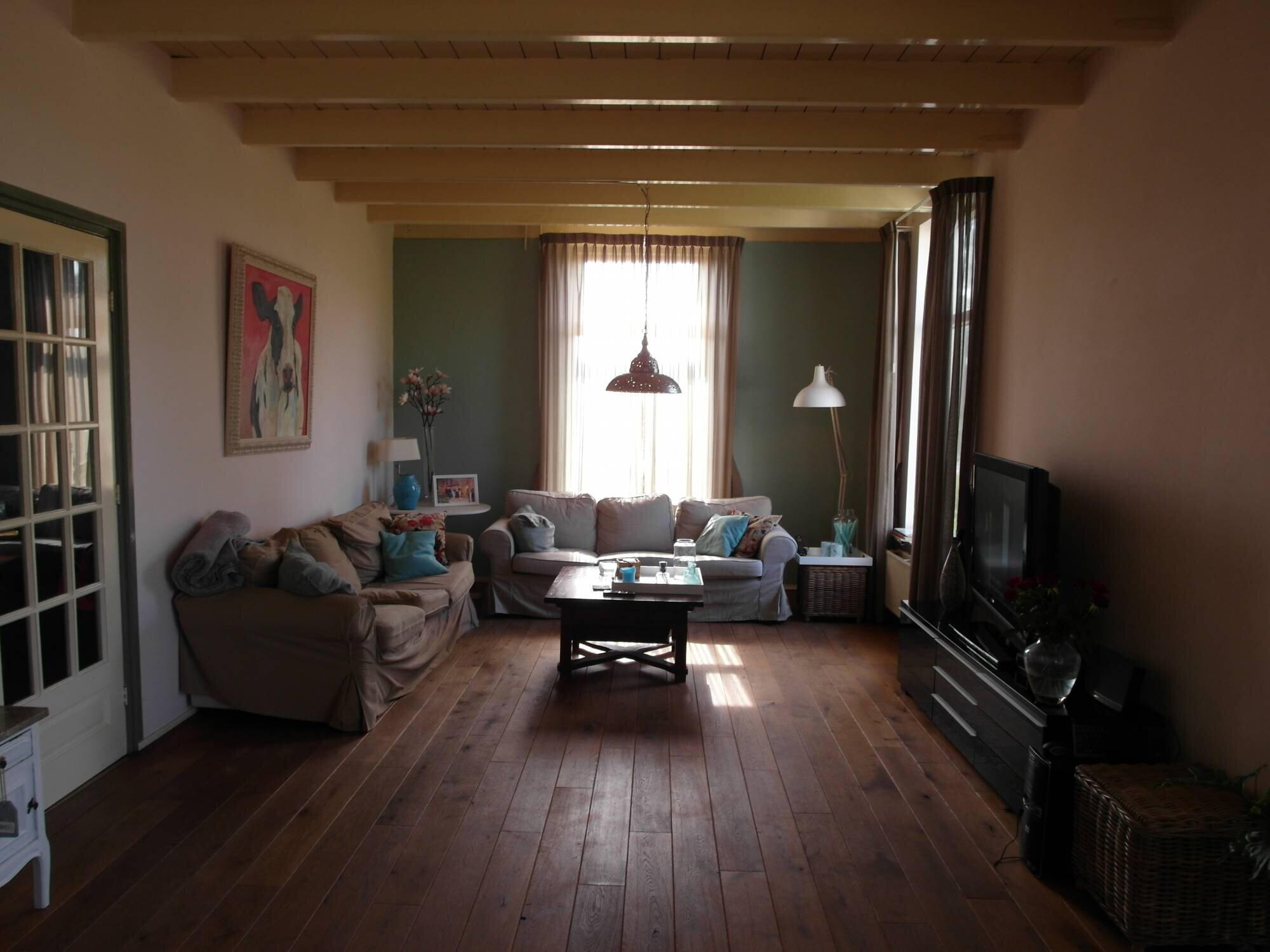 Ruime woonkamer voorzien van fraaie houten vloer en open haard. Openslaande deuren naar zeer ruime tuin. Separate keuken, slaapkamer. Trap naar 1e verdieping. Tussen de begane grond en de 1e verdieping bevindt zich de sfeervolle badkamer voorzien van ligbad en separate douche en toilet.