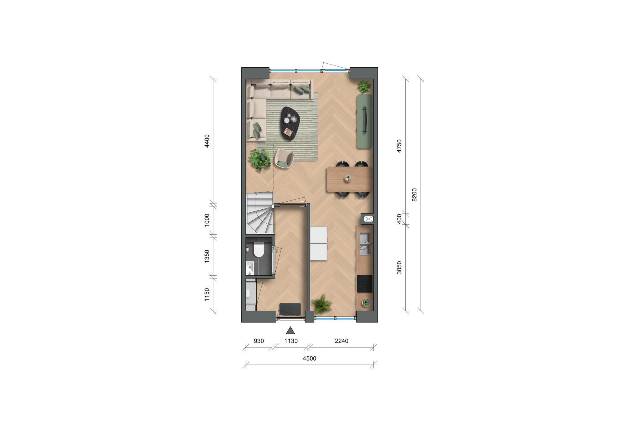 De ramen die doorlopen tot aan de vloer voor zorgen volop daglicht en een levendig zicht op de straat. Kies je voor de royale parallelle opstelling, dan profiteer je in de keuken van extra werkruimte en comfort.