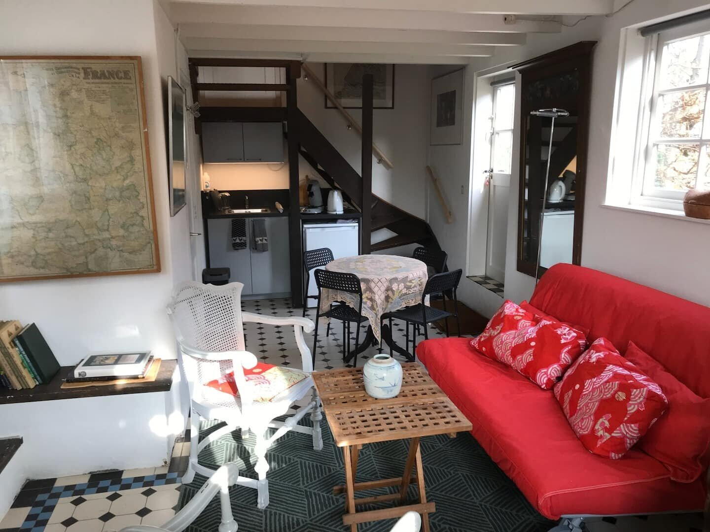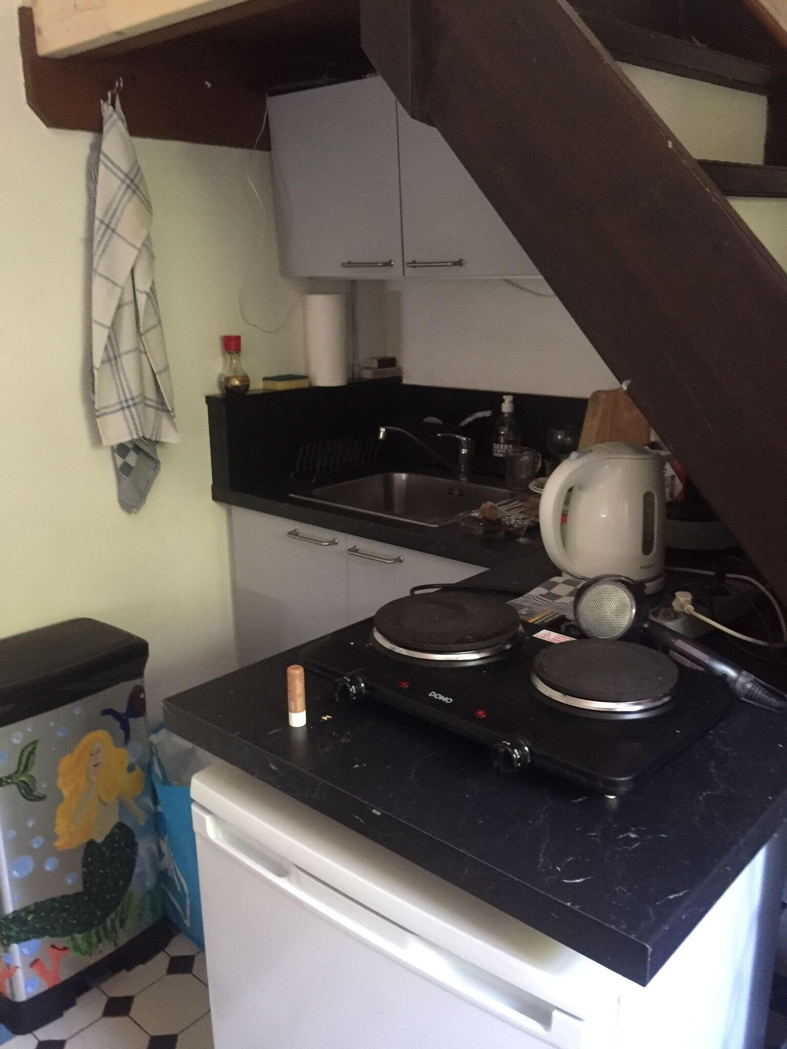 Indeling: Hal, woonkamer voorzien van keuken en trap naar slaapkamer. Badkamer met douche en wastafel.