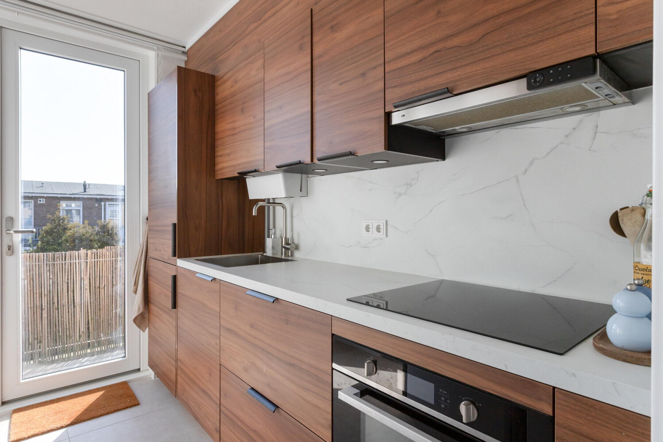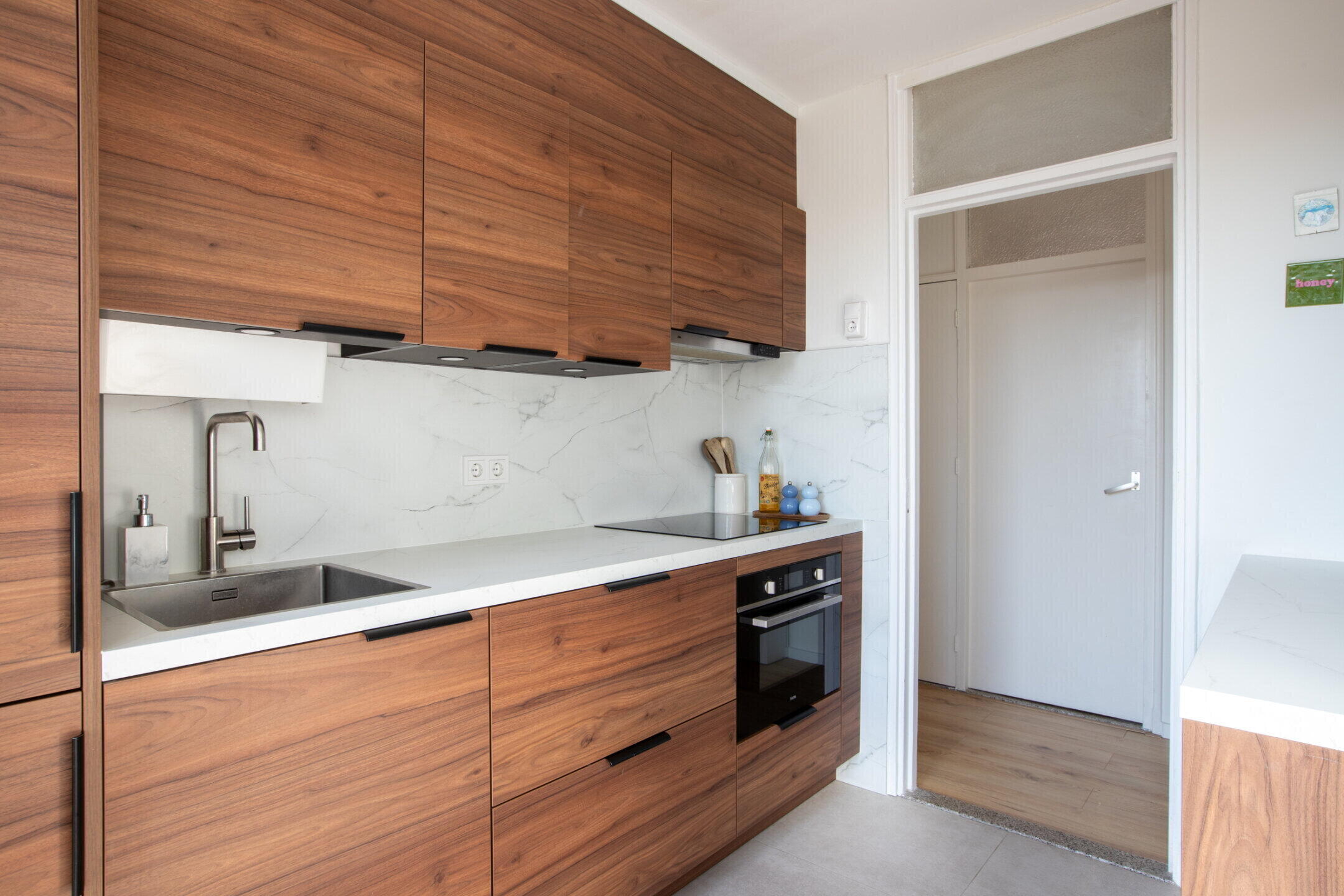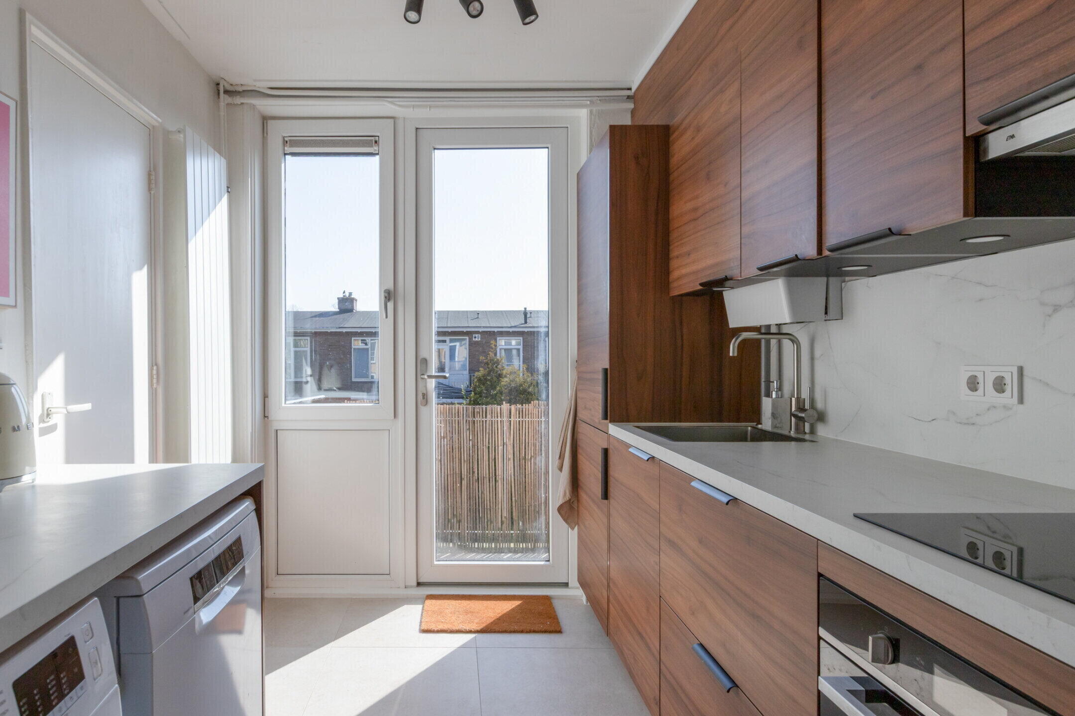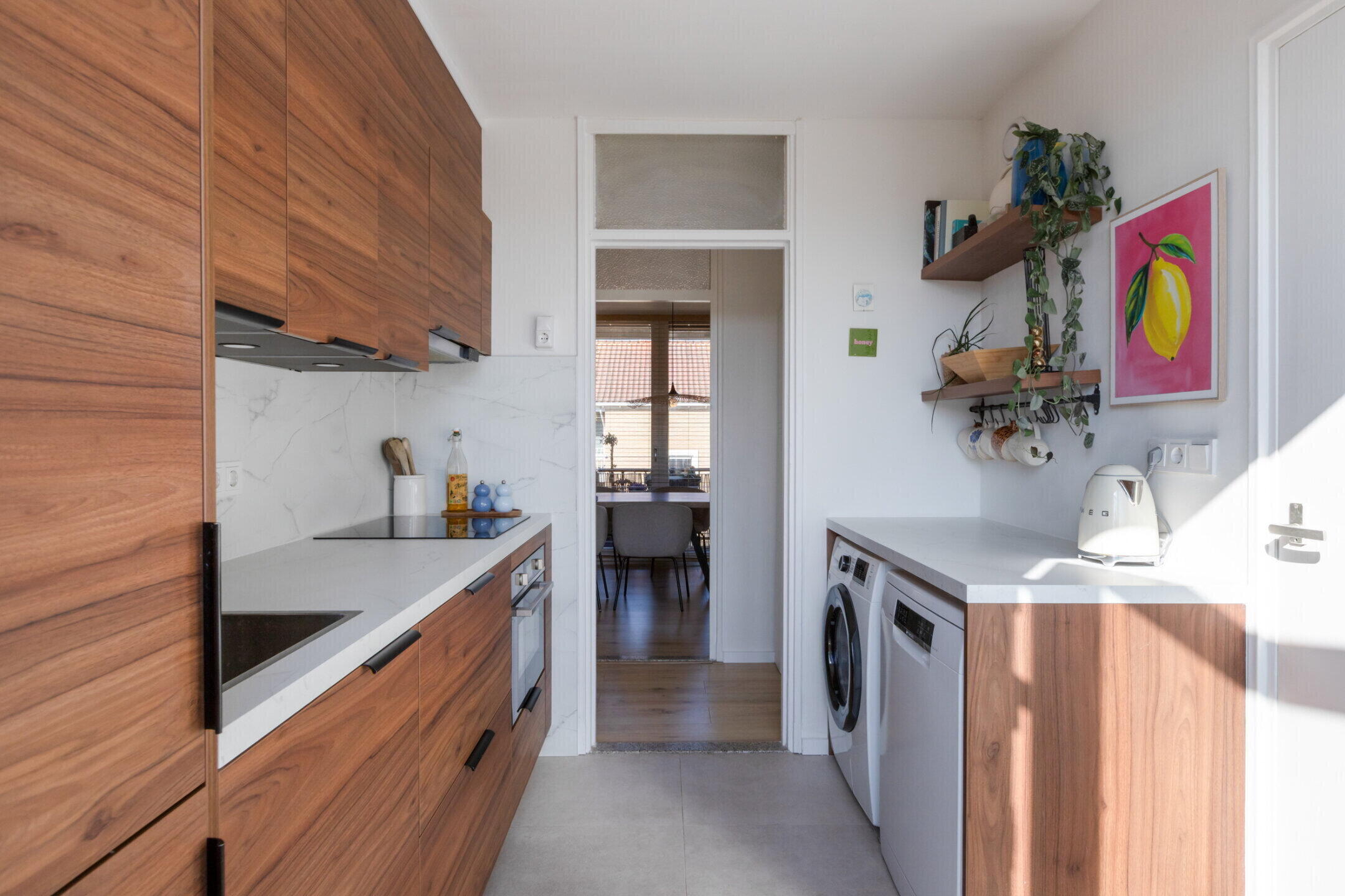 Ruime gesloten, maar moderne en recent vernieuwde keukenruimte van ca. 6,4m2 met recht modern keukenblok v.v. oven, inductiekookplaat, afzuiger, vaatwasser en diverse laad- en bergruimte.