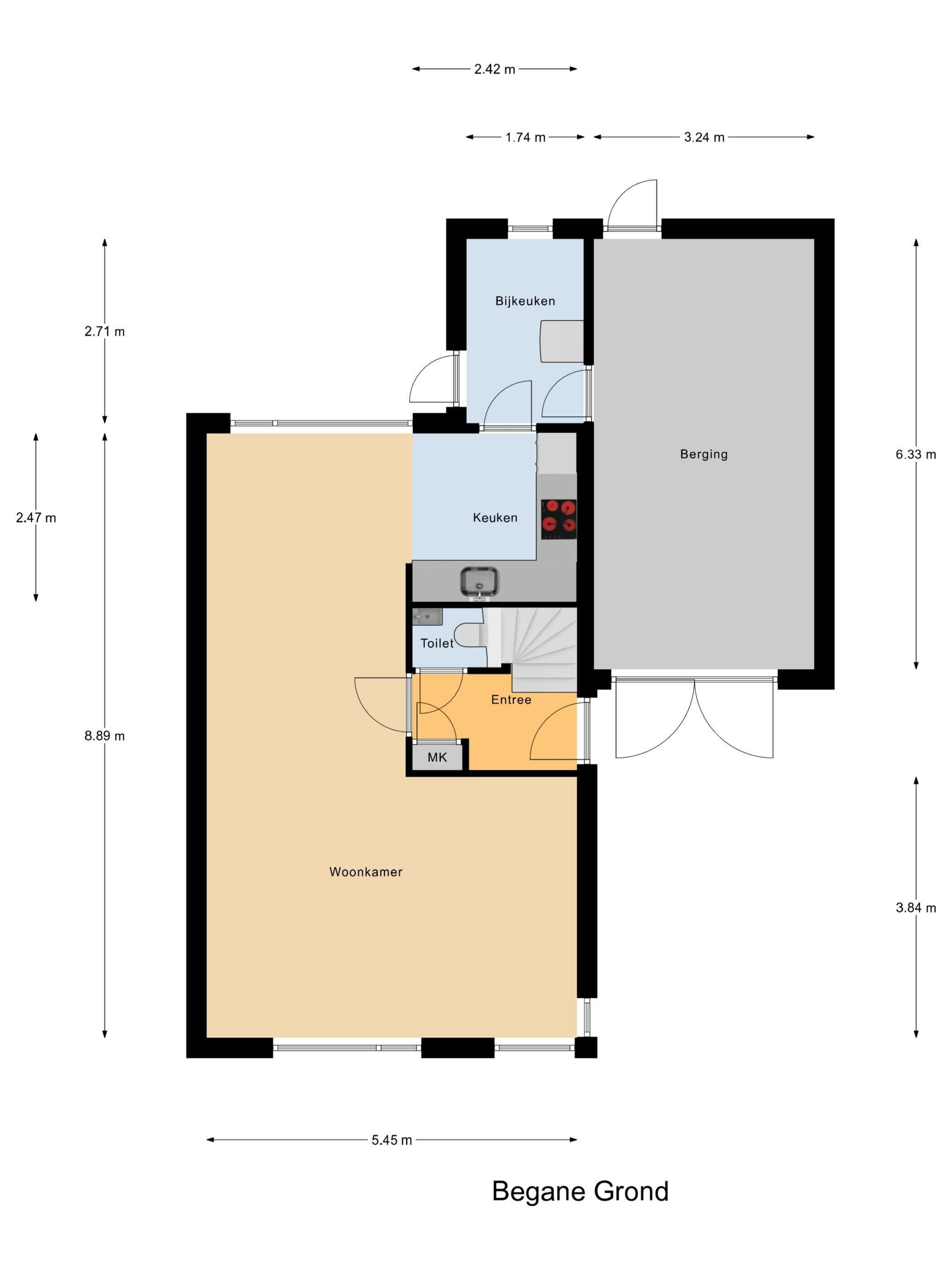 De wasruimte/bijkeuken en een gasten toilet zijn eveneens aanwezig op de begane grond.