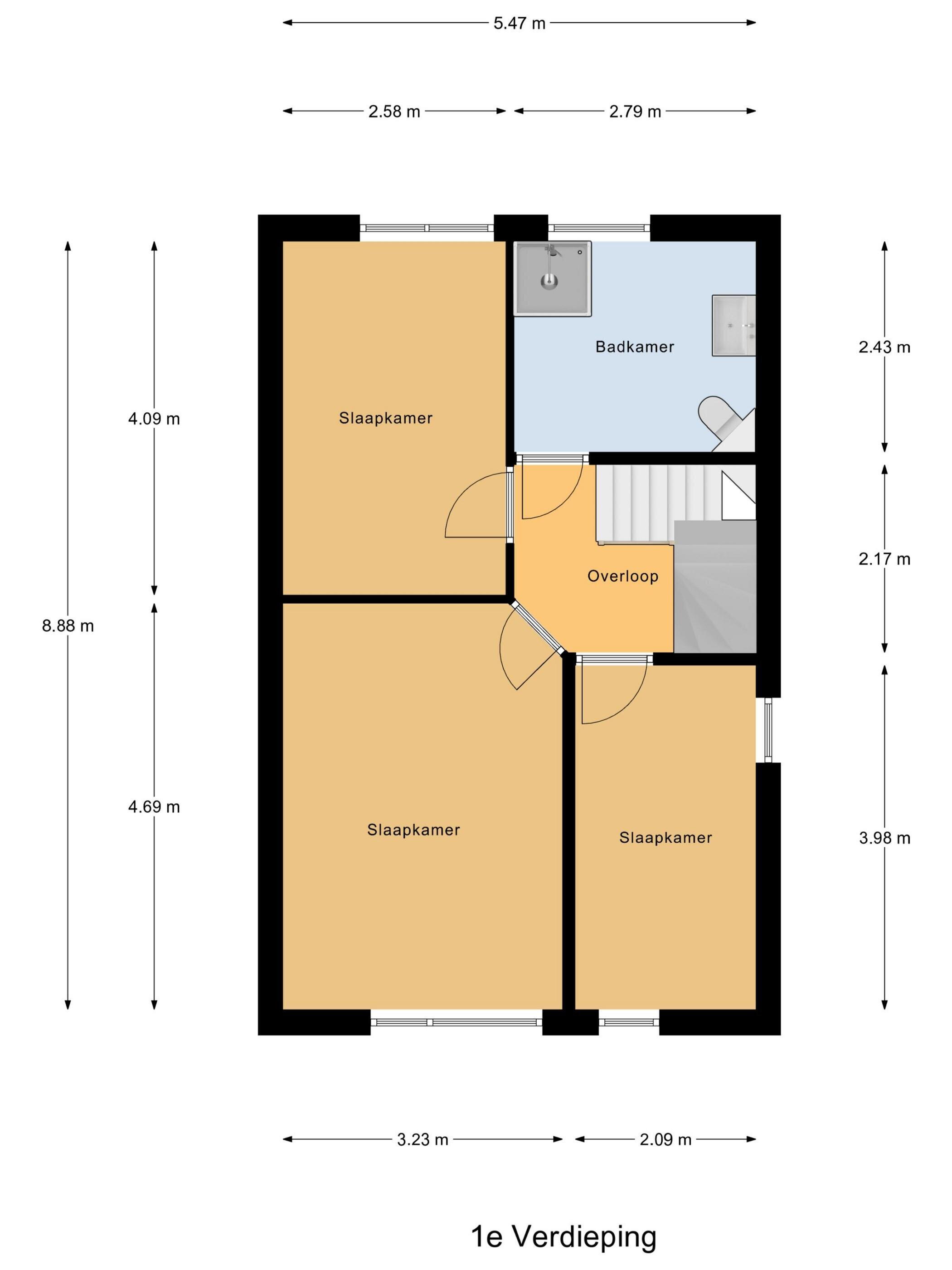 Slaapkamer 1 (4.69 x 3.23 meter) is de grootste slaapkamer en bevindt zich aan de voorzijde van het huis.