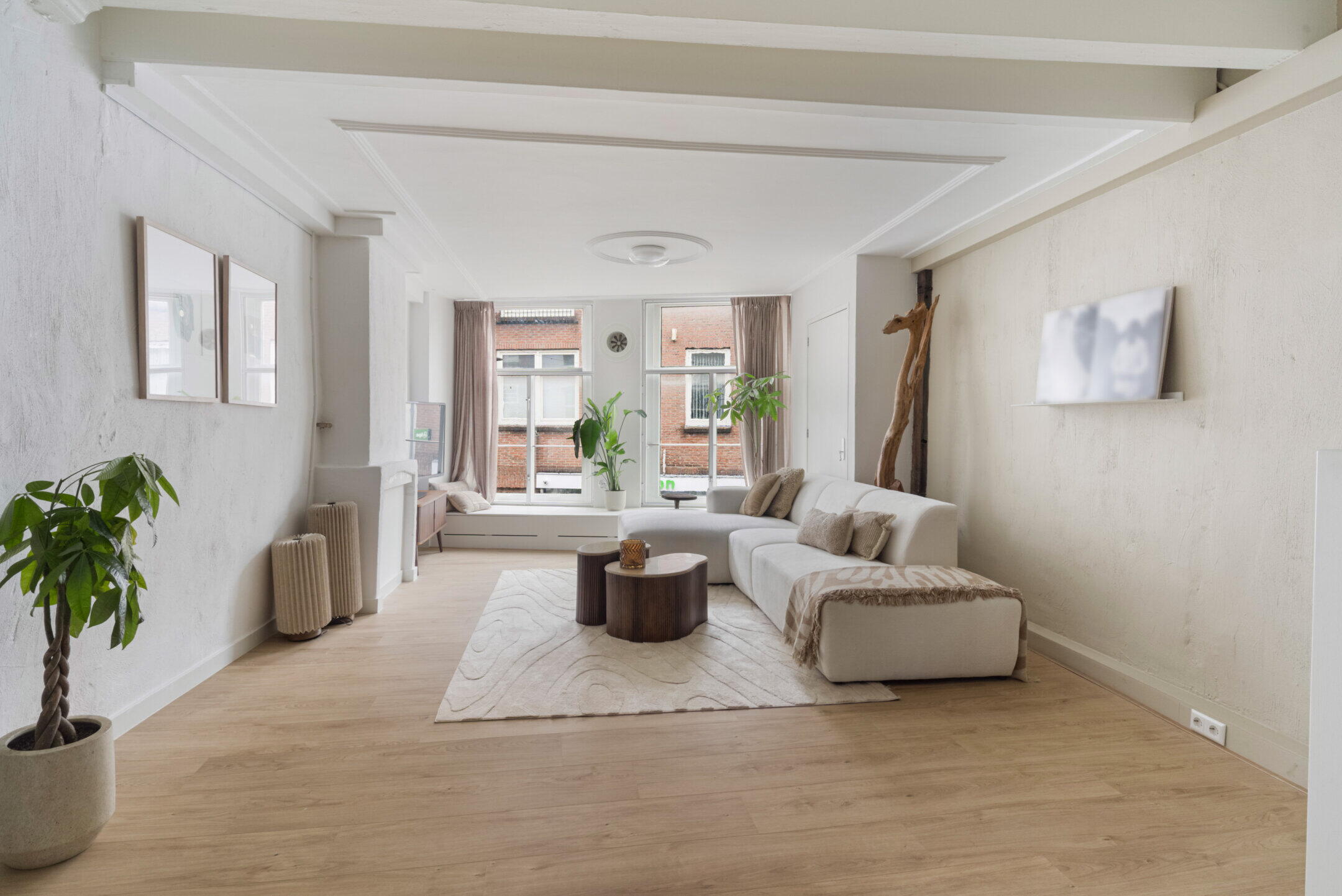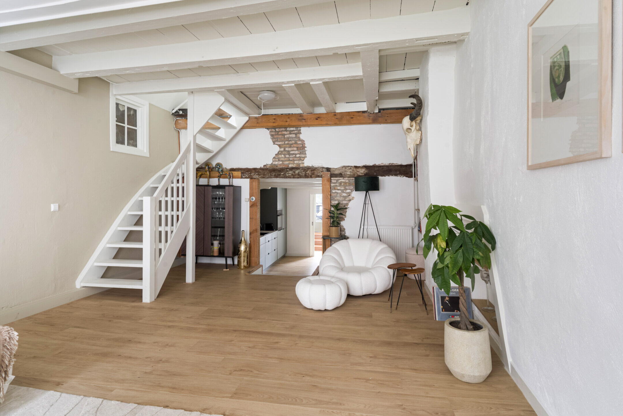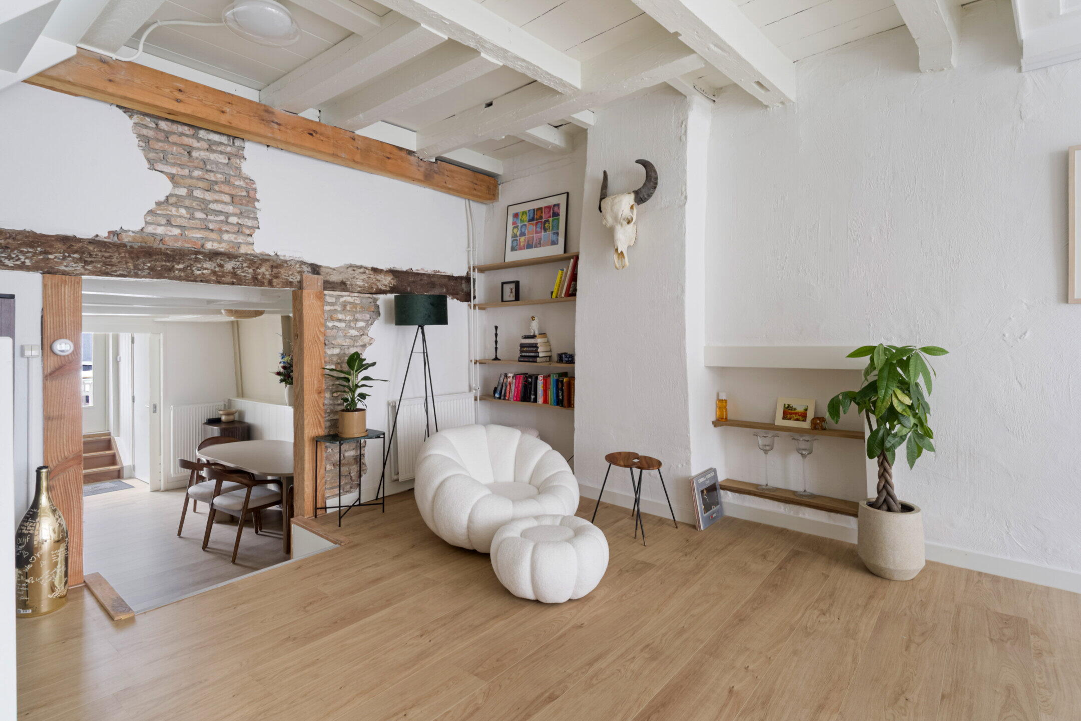 Via een korte trap bereik je de ruime woonkamer van circa 31 m². Grote ramen, hoge plafonds en fraaie houten balken in het zicht geven deze ruimte een lichte en karaktervolle sfeer. Vanuit de zitvensterbank heb je een prachtig uitzicht over de Hoogstraat en de Markt – een uniek panorama dat het stadsleven optimaal laat beleven.