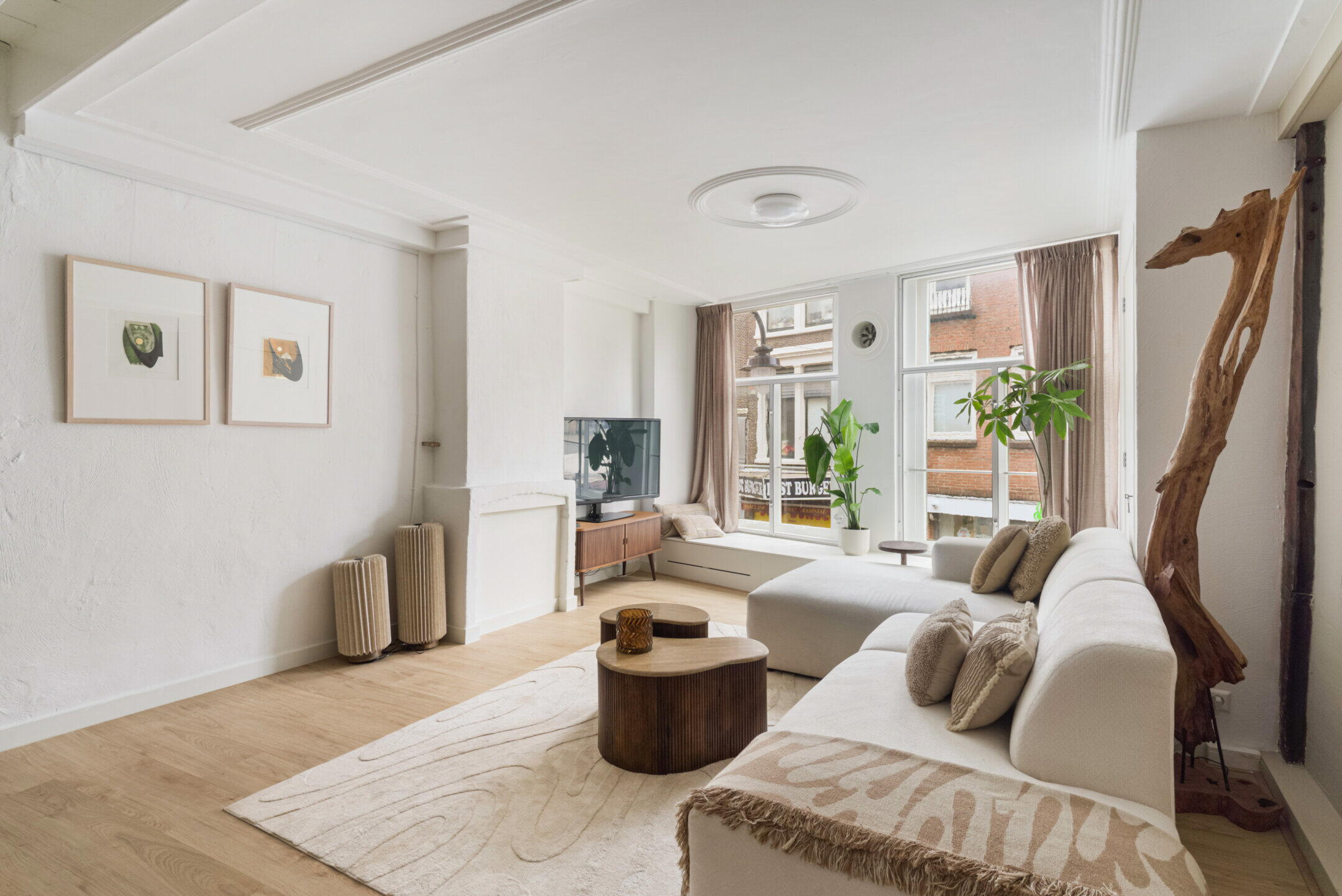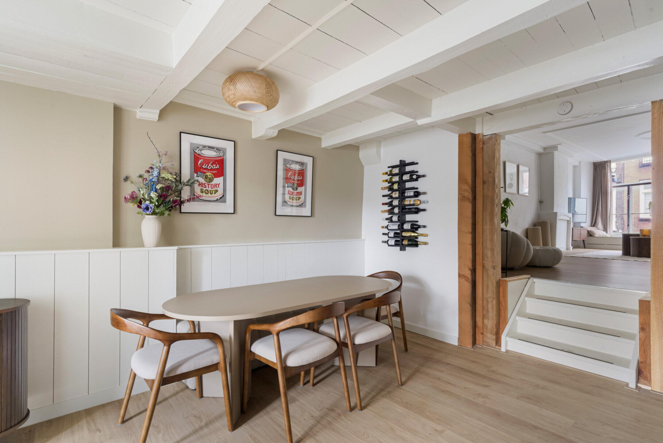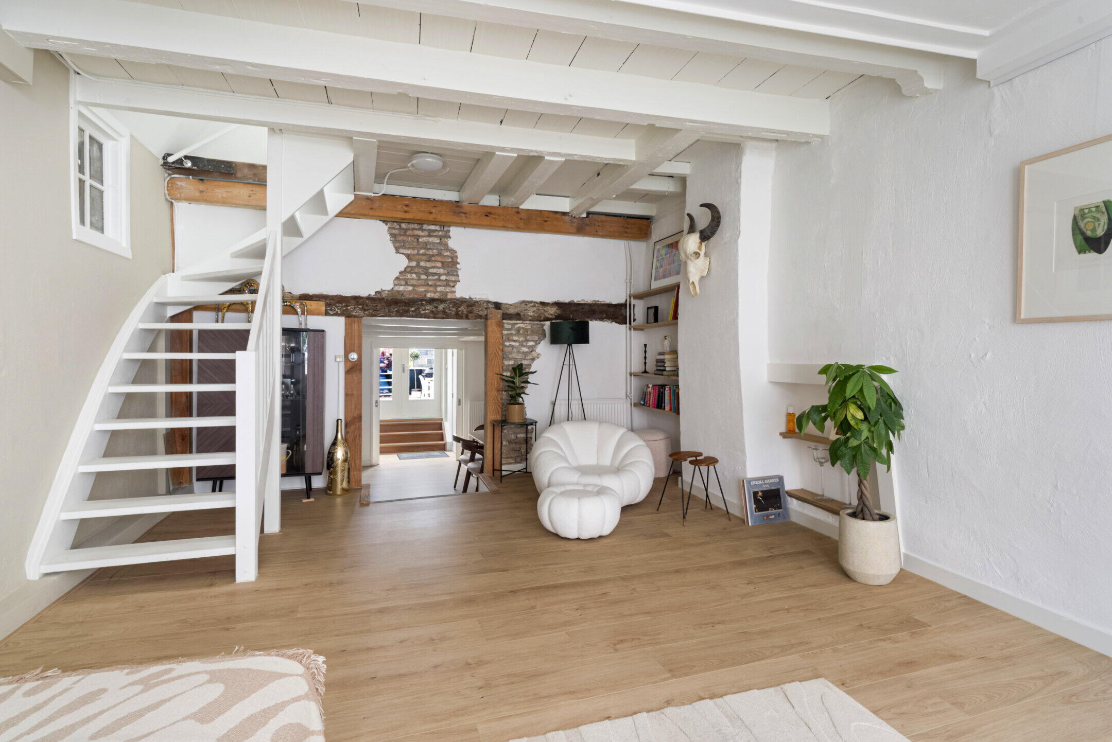 Via een korte trap bereik je de ruime woonkamer van circa 31 m². Grote ramen, hoge plafonds en fraaie houten balken in het zicht geven deze ruimte een lichte en karaktervolle sfeer. Vanuit de zitvensterbank heb je een prachtig uitzicht over de Hoogstraat en de Markt – een uniek panorama dat het stadsleven optimaal laat beleven.