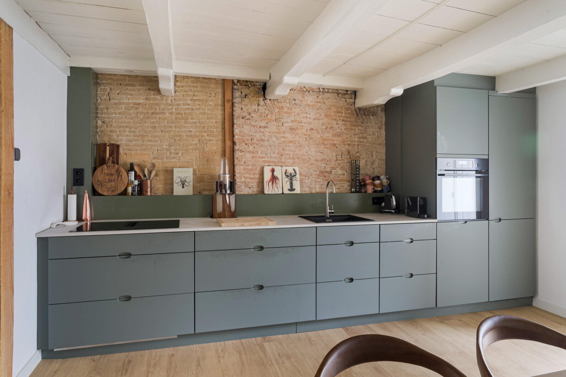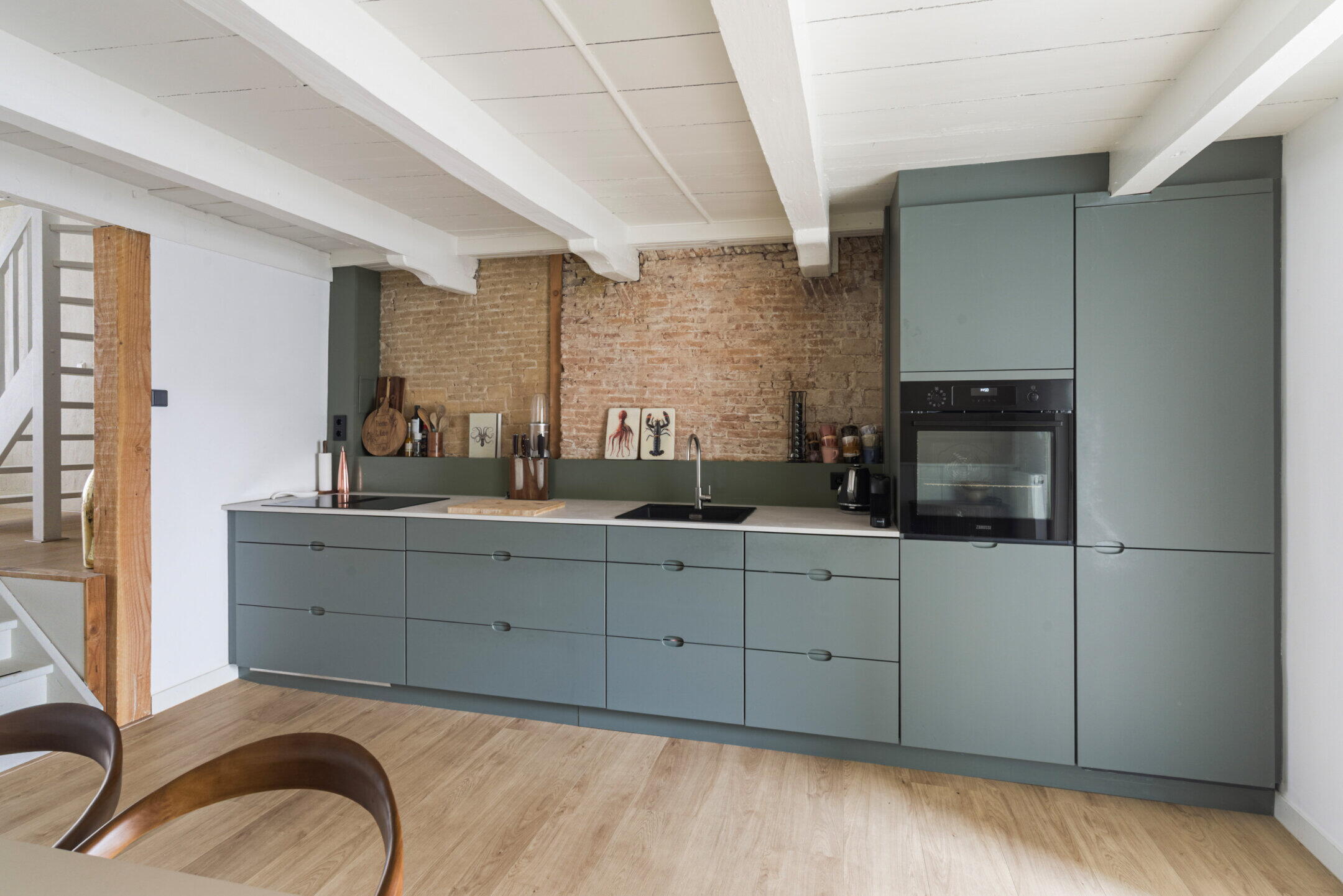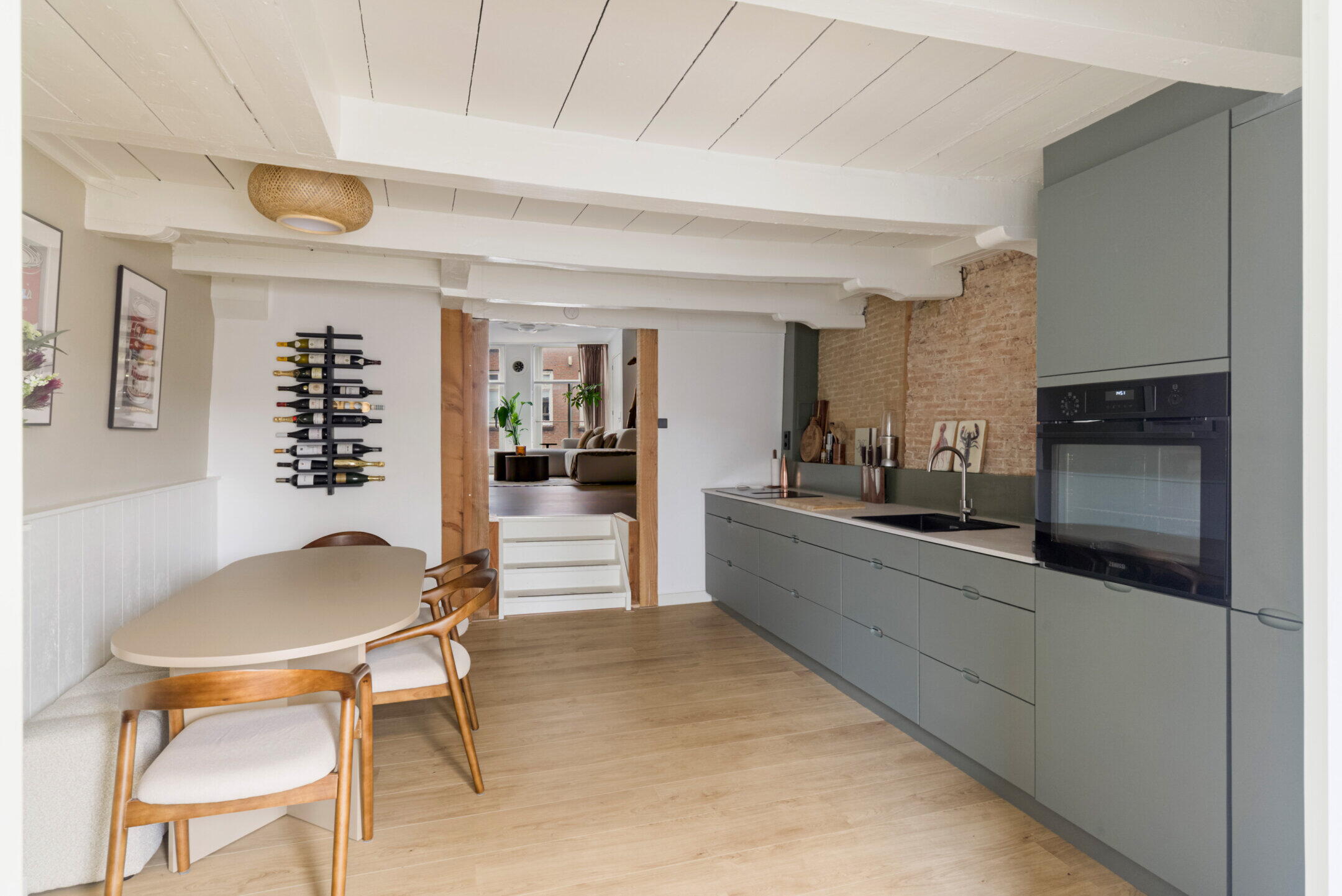 - Moderne woonkeuken in saliegroen met complete inbouwapparatuur;