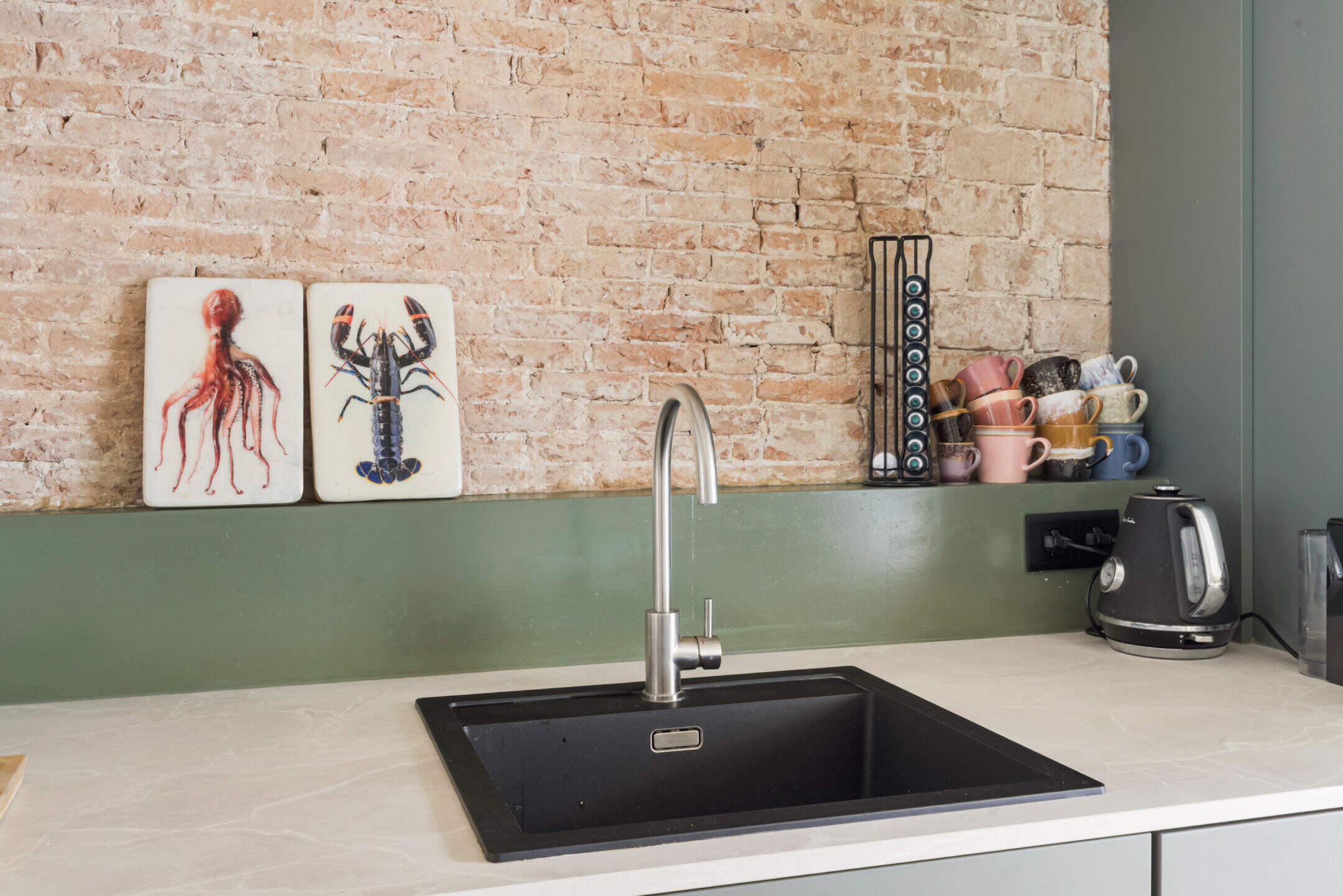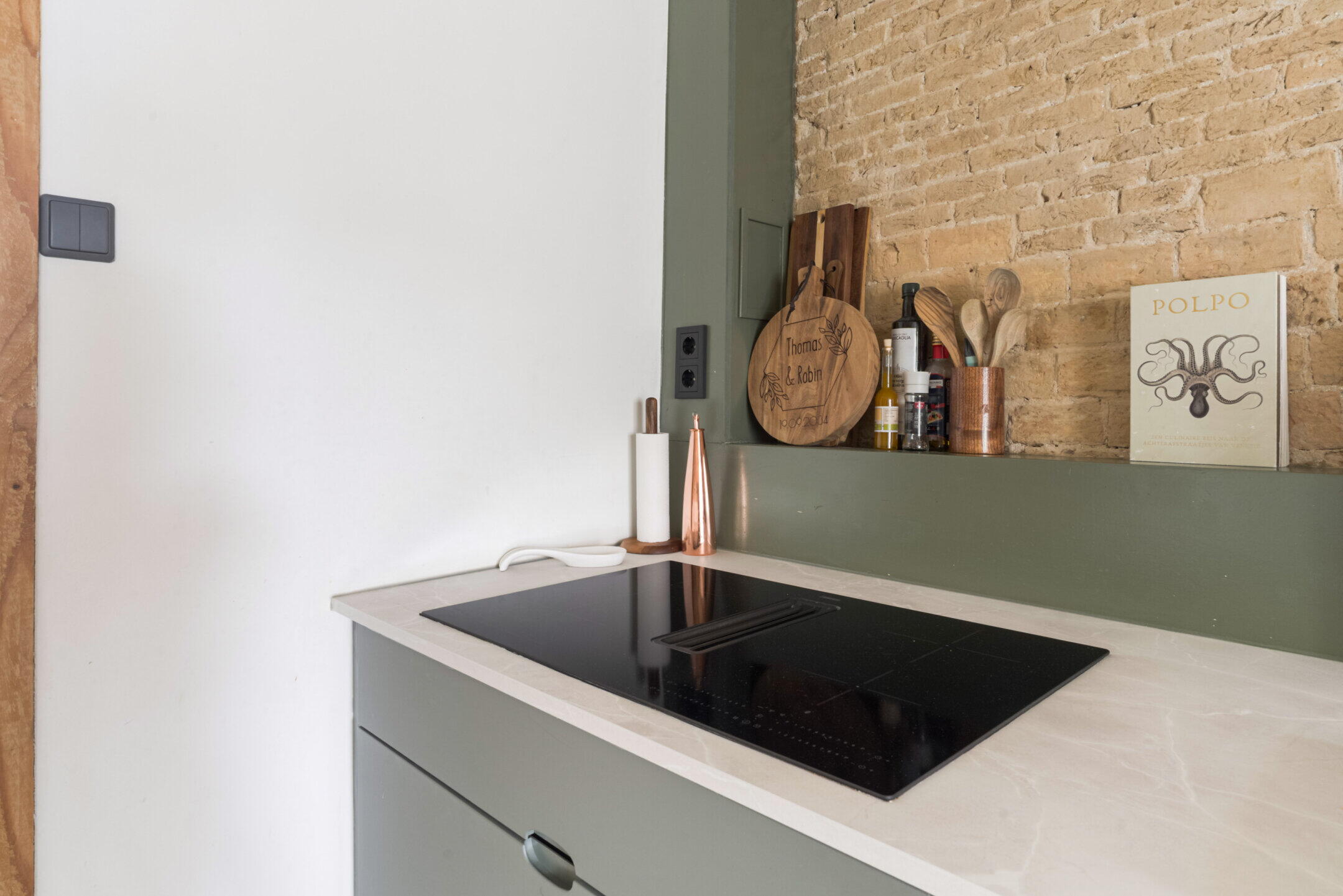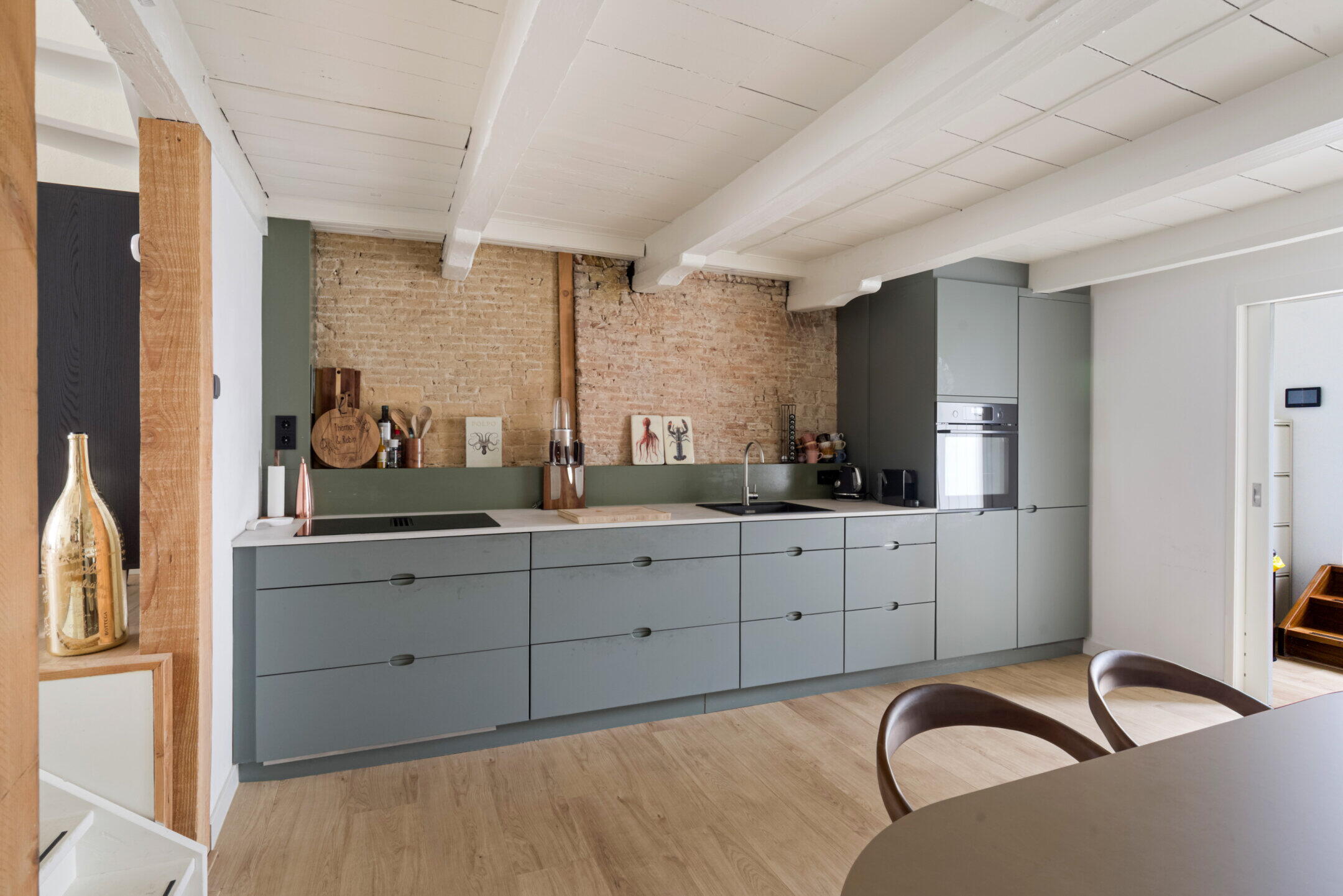 - Moderne woonkeuken in saliegroen met complete inbouwapparatuur;