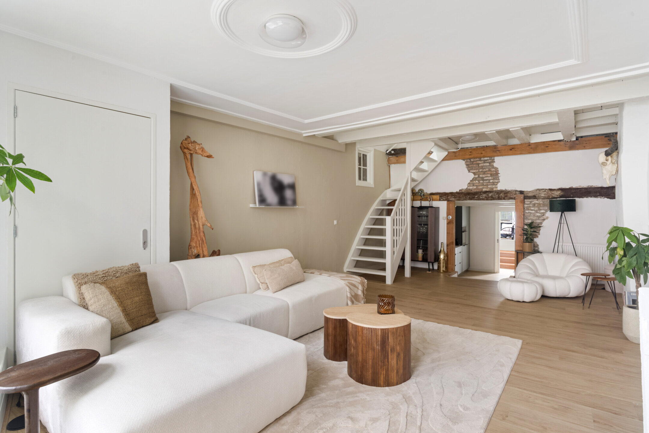 - Sfeervolle woonkamer met hoge plafonds, grote ramen en zichtbare houten balken;