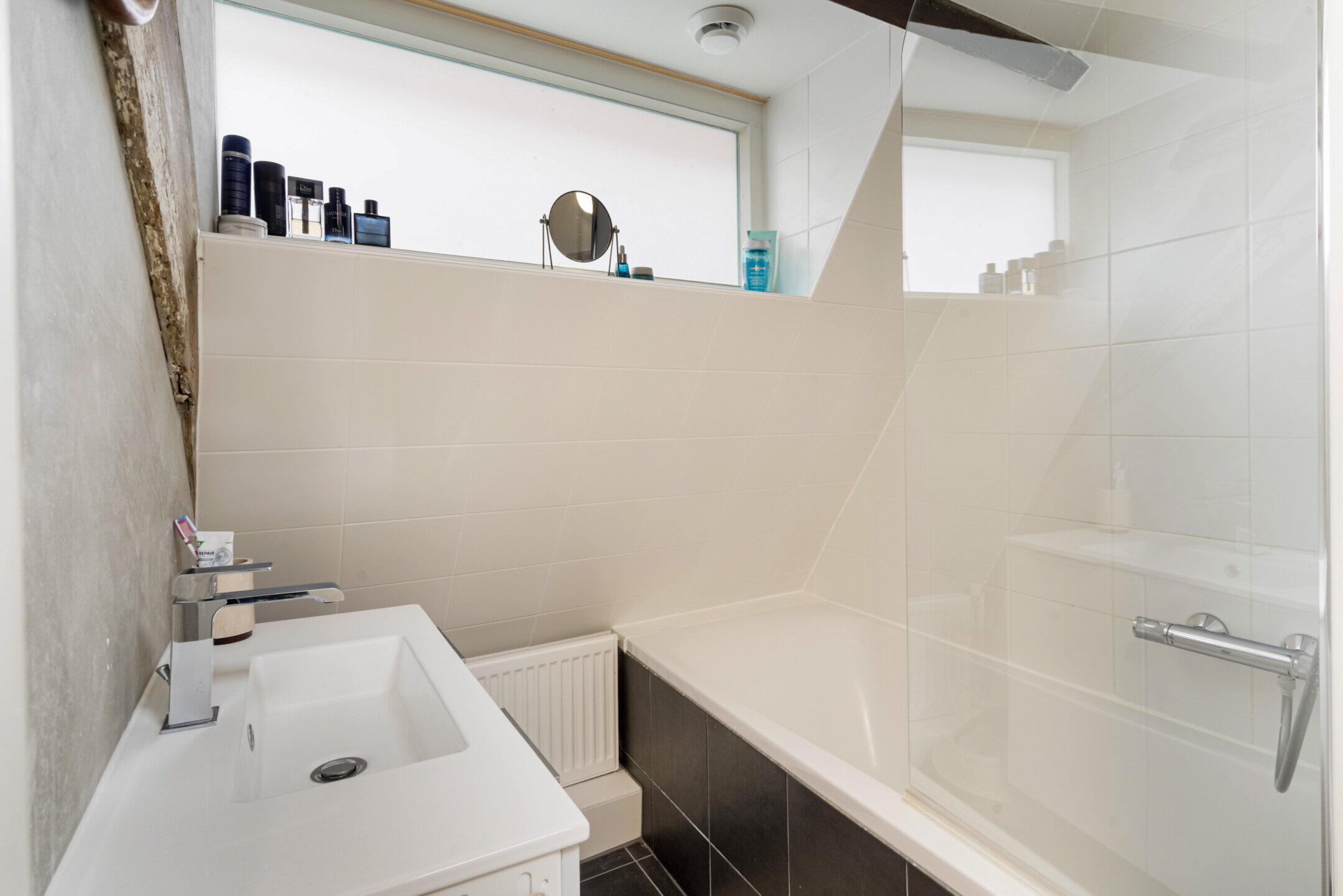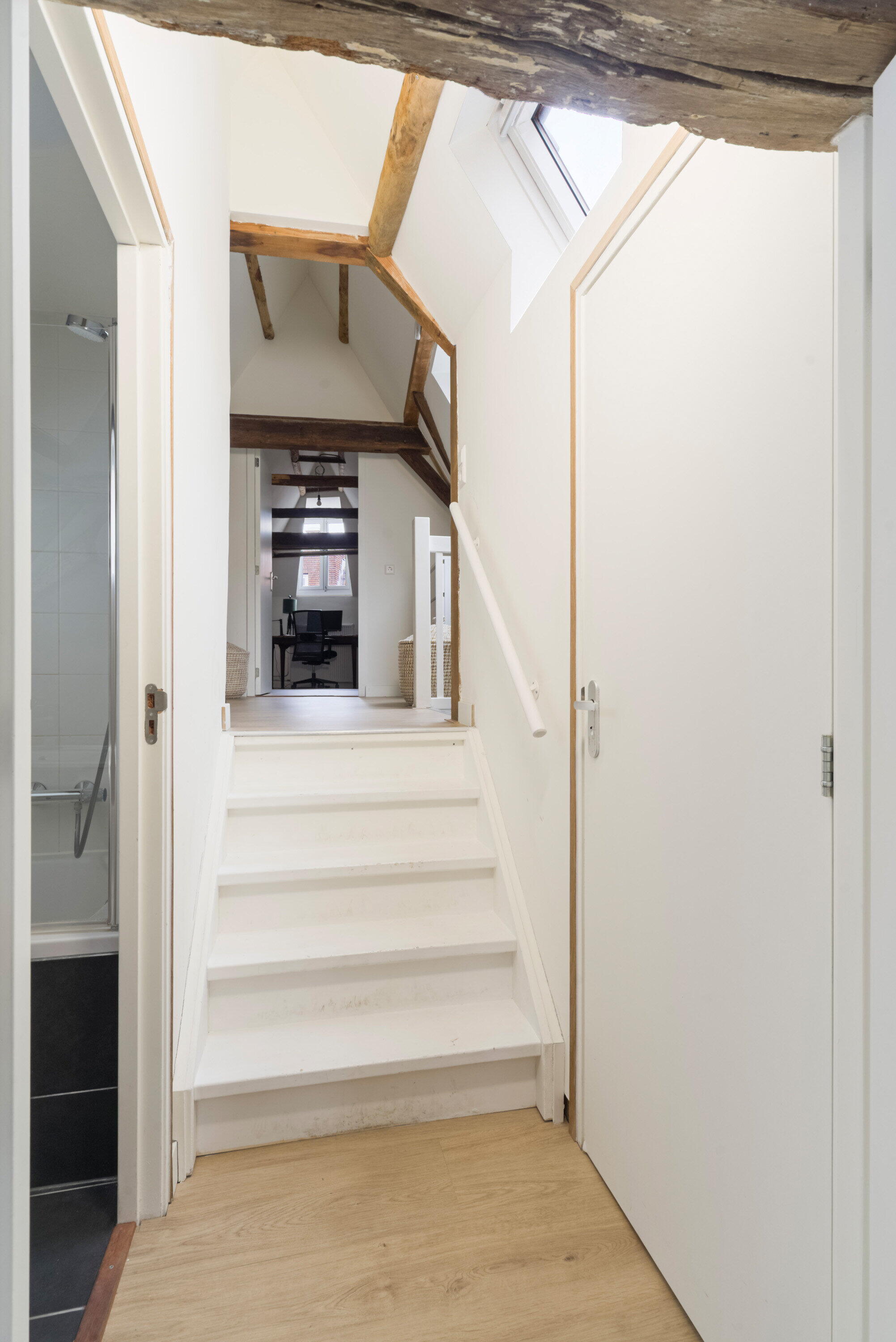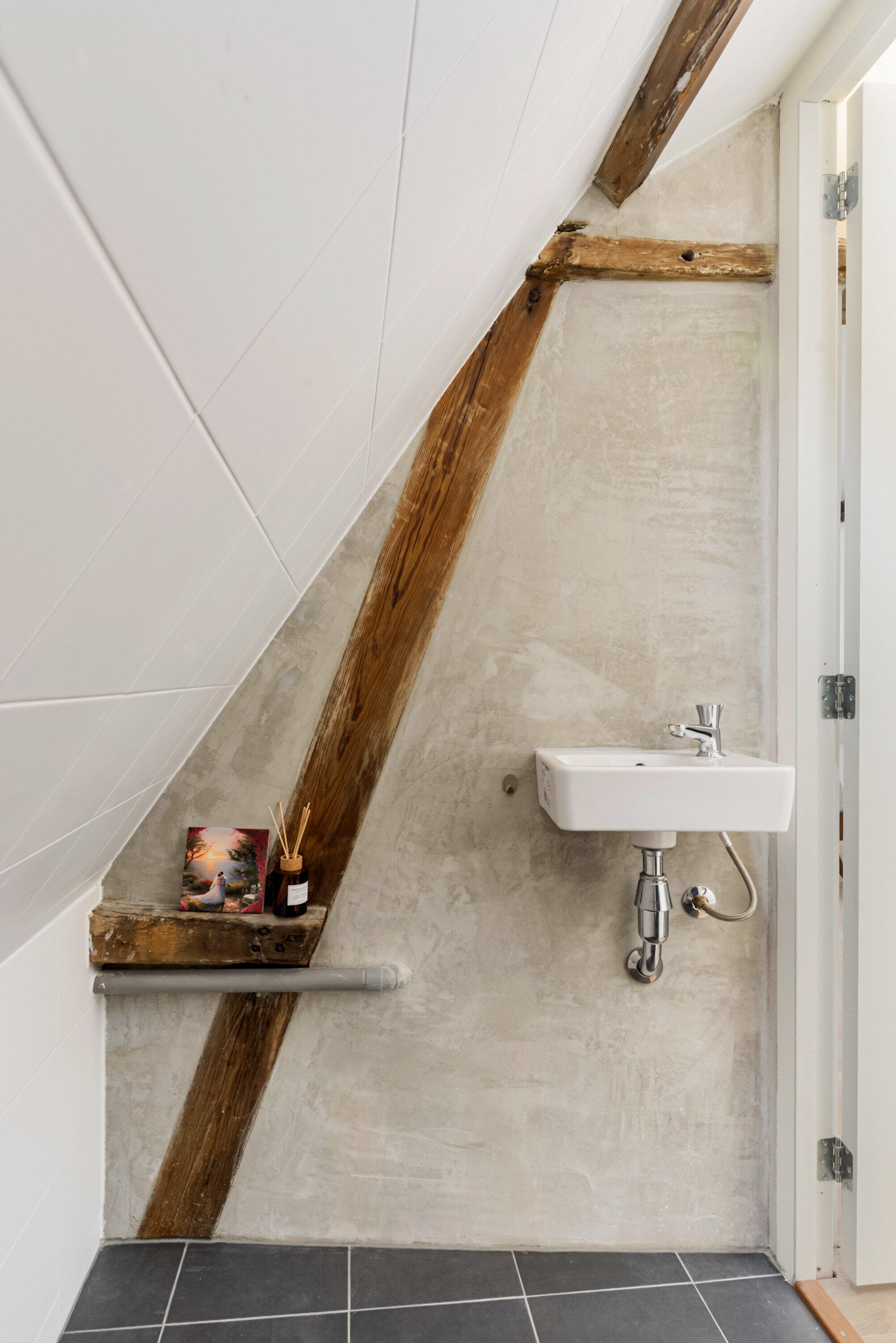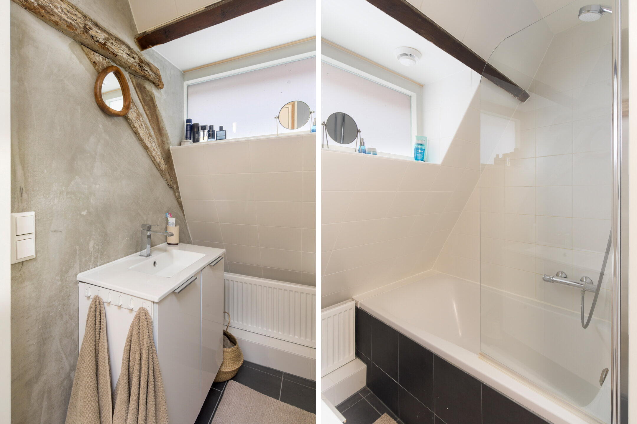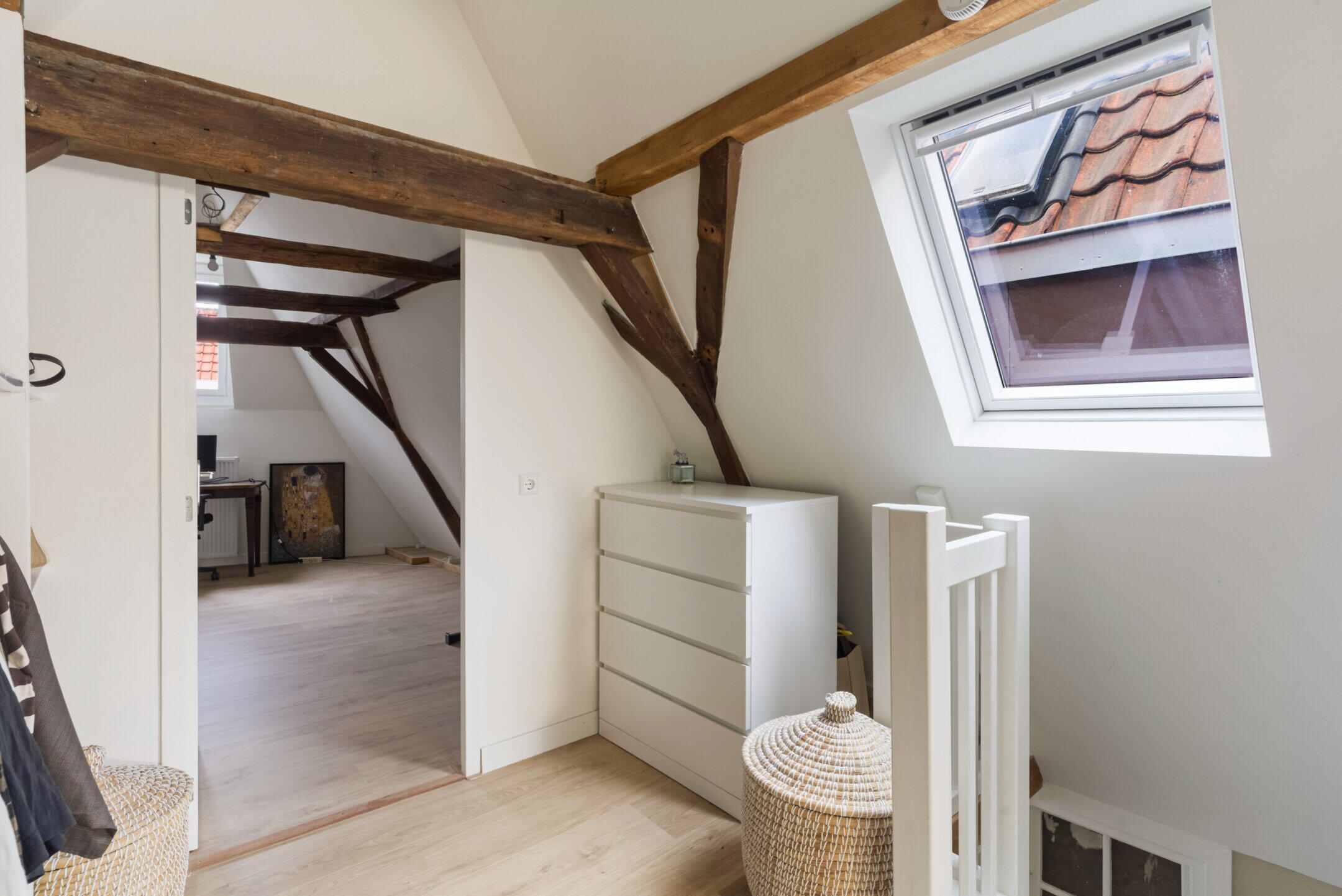 De bovenverdieping is speels ingedeeld en volledig geïsoleerd, waarbij de fraaie houten spanten en gordingen zichtbaar zijn gebleven en zorgen voor een authentieke uitstraling. Op de overloop bevinden zich een separaat toilet en een moderne badkamer, voorzien van ligbad, douche en wastafelmeubel.