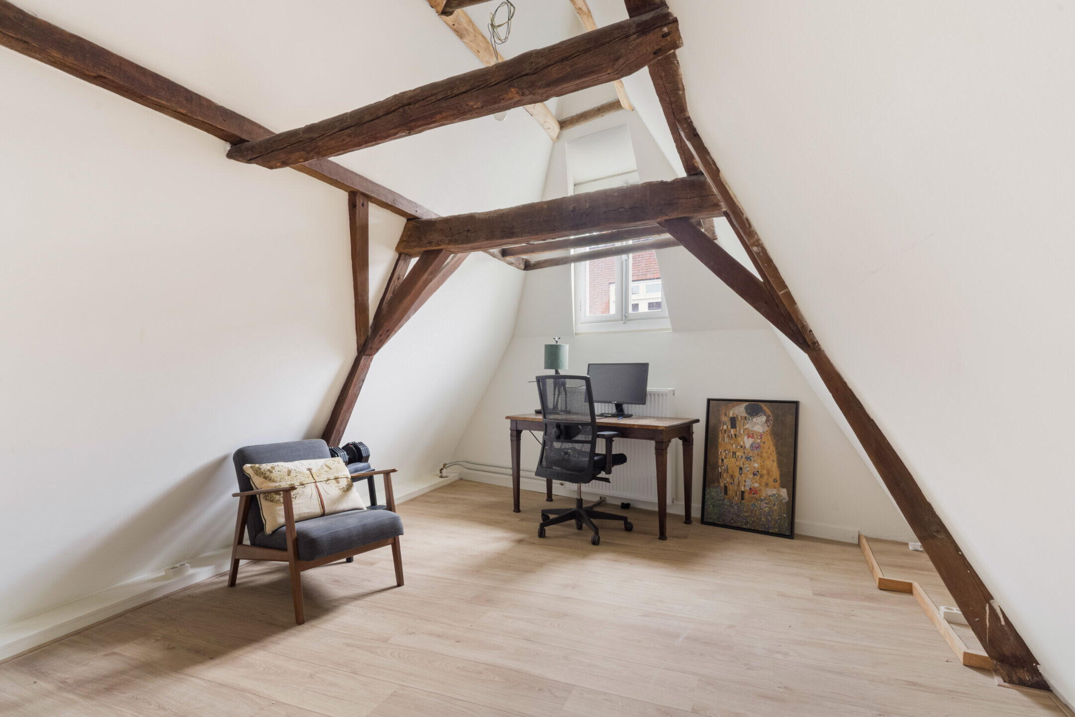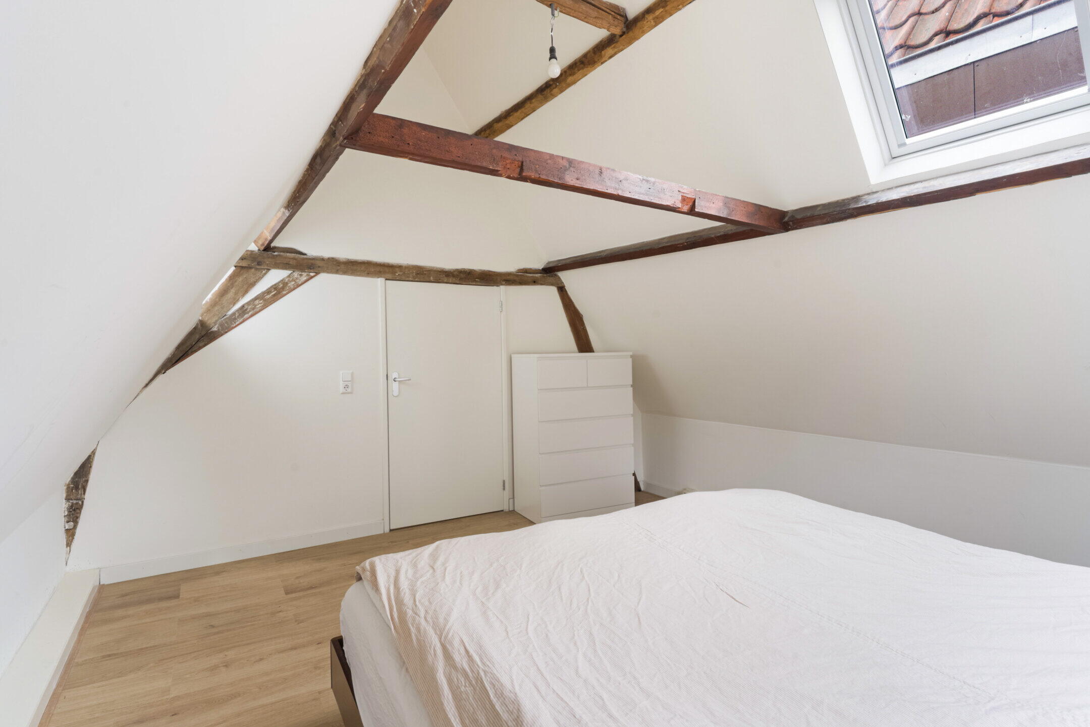 De tweede slaapkamer van circa 15 m² bevindt zich aan de achterzijde en beschikt eveneens over een karakteristiek balkenplafond.