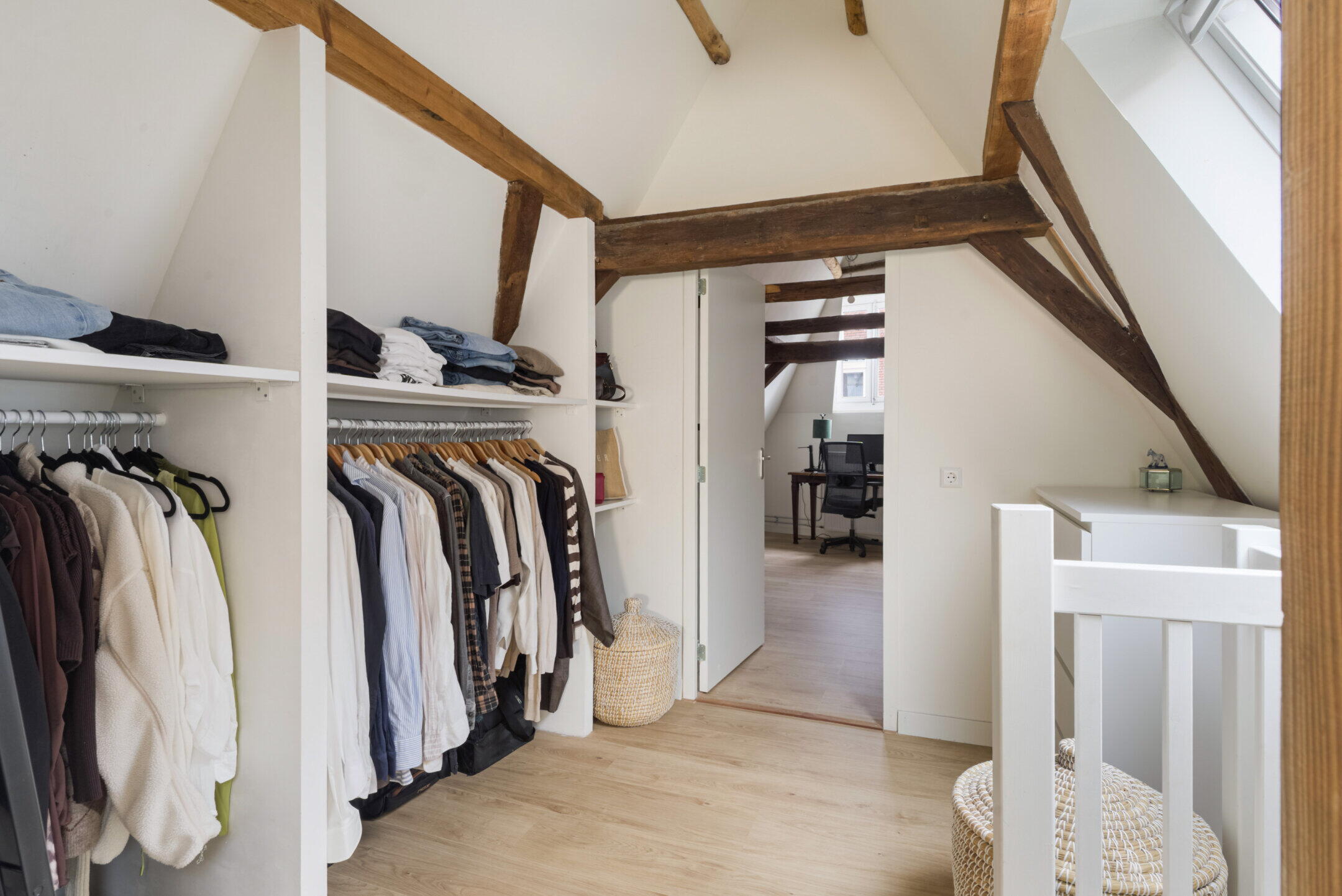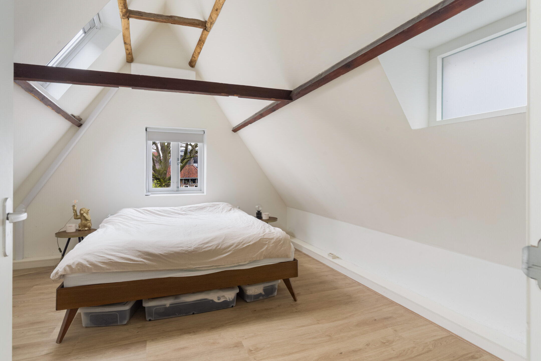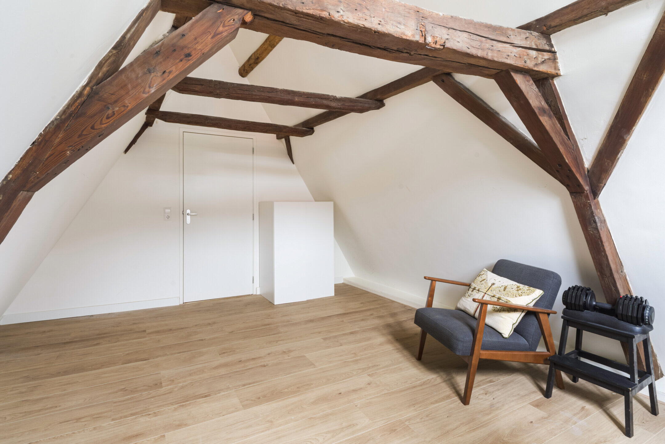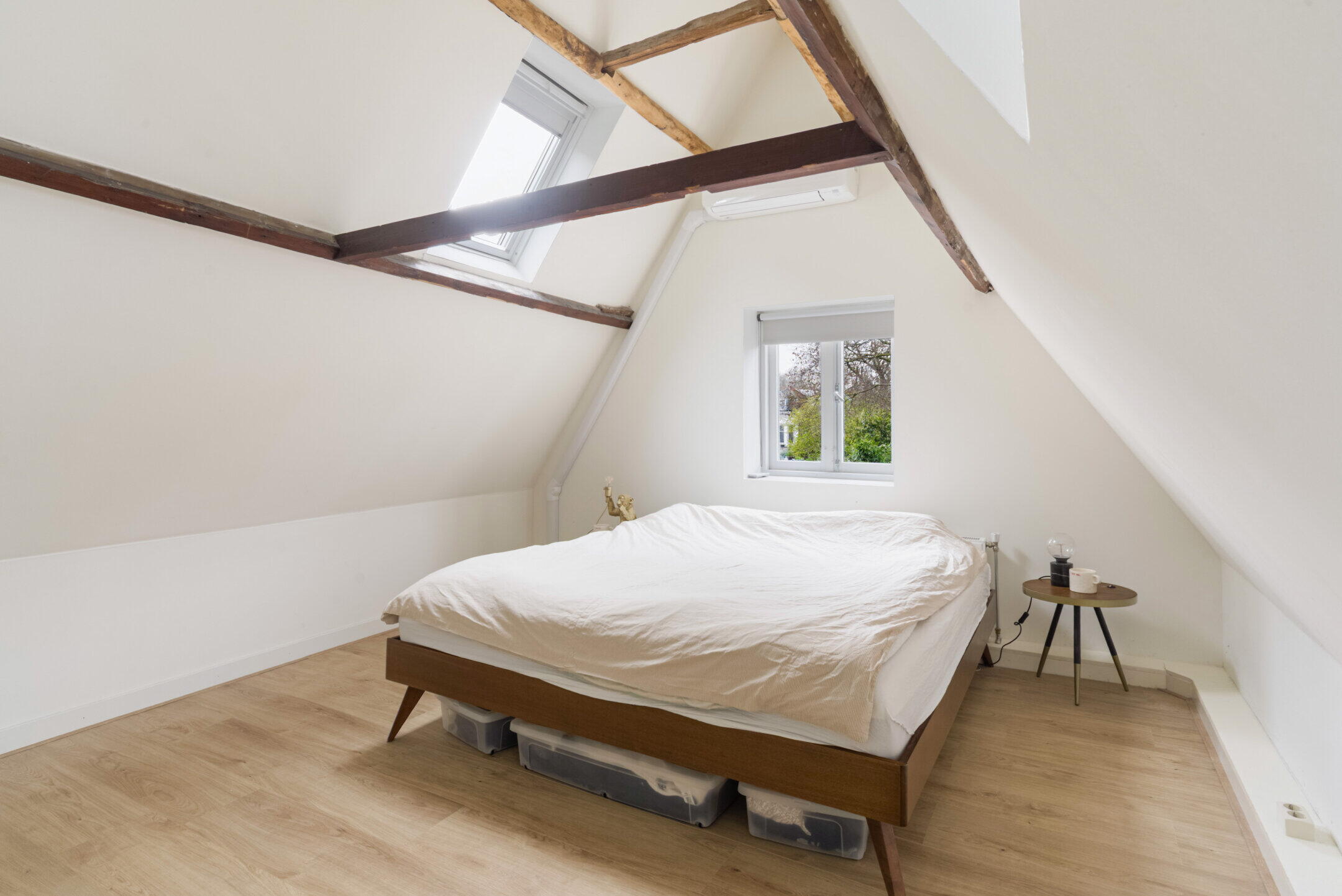 Aan de voorzijde ligt de eerste slaapkamer van circa 13 m², met een indrukwekkend nokhoog balkenplafond en meerdere dakramen die zorgen voor veel daglicht.
