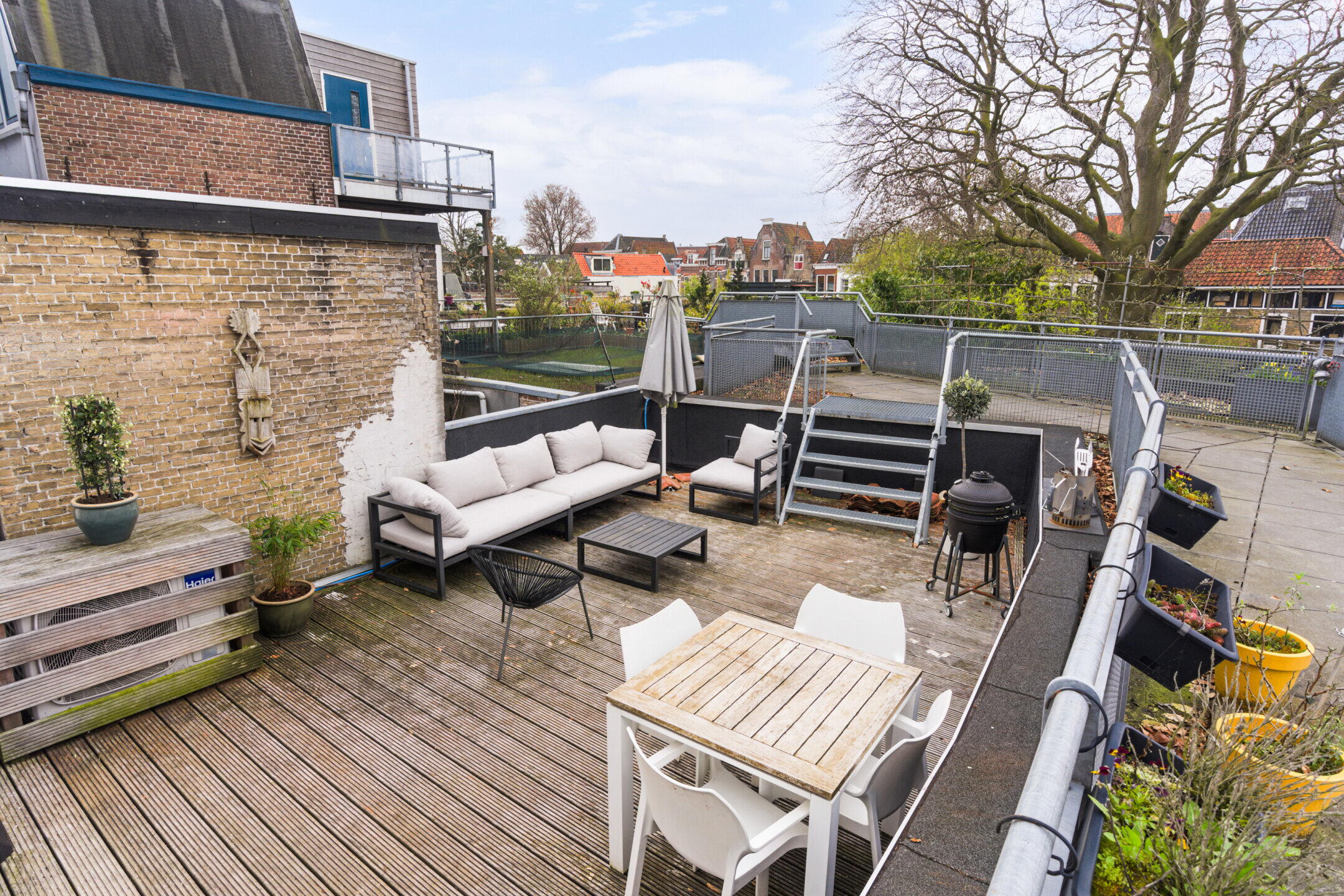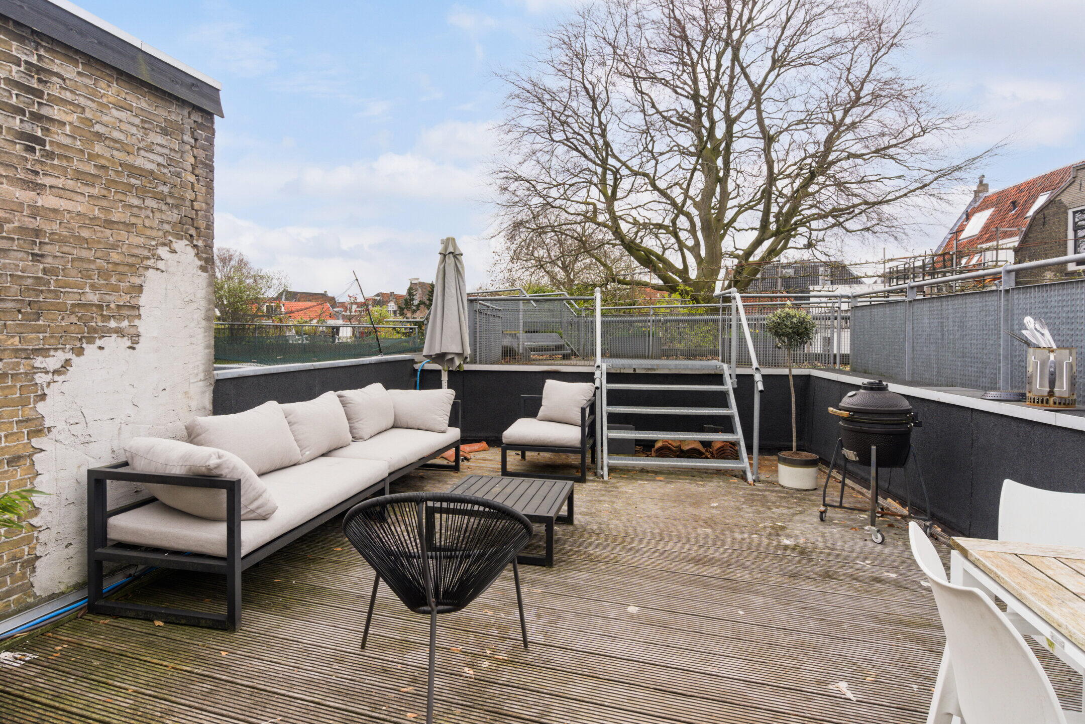 Op deze verdieping bevindt zich het royale dakterras van circa 35 m², gunstig gelegen op het westen en uitgevoerd met fraaie houten vlonderplanken. Hier geniet je vrijwel de hele middag en avond van de zon, terwijl het uitzicht op omliggende bomen zorgt voor een verrassend rustige en groene sfeer midden in de binnenstad.