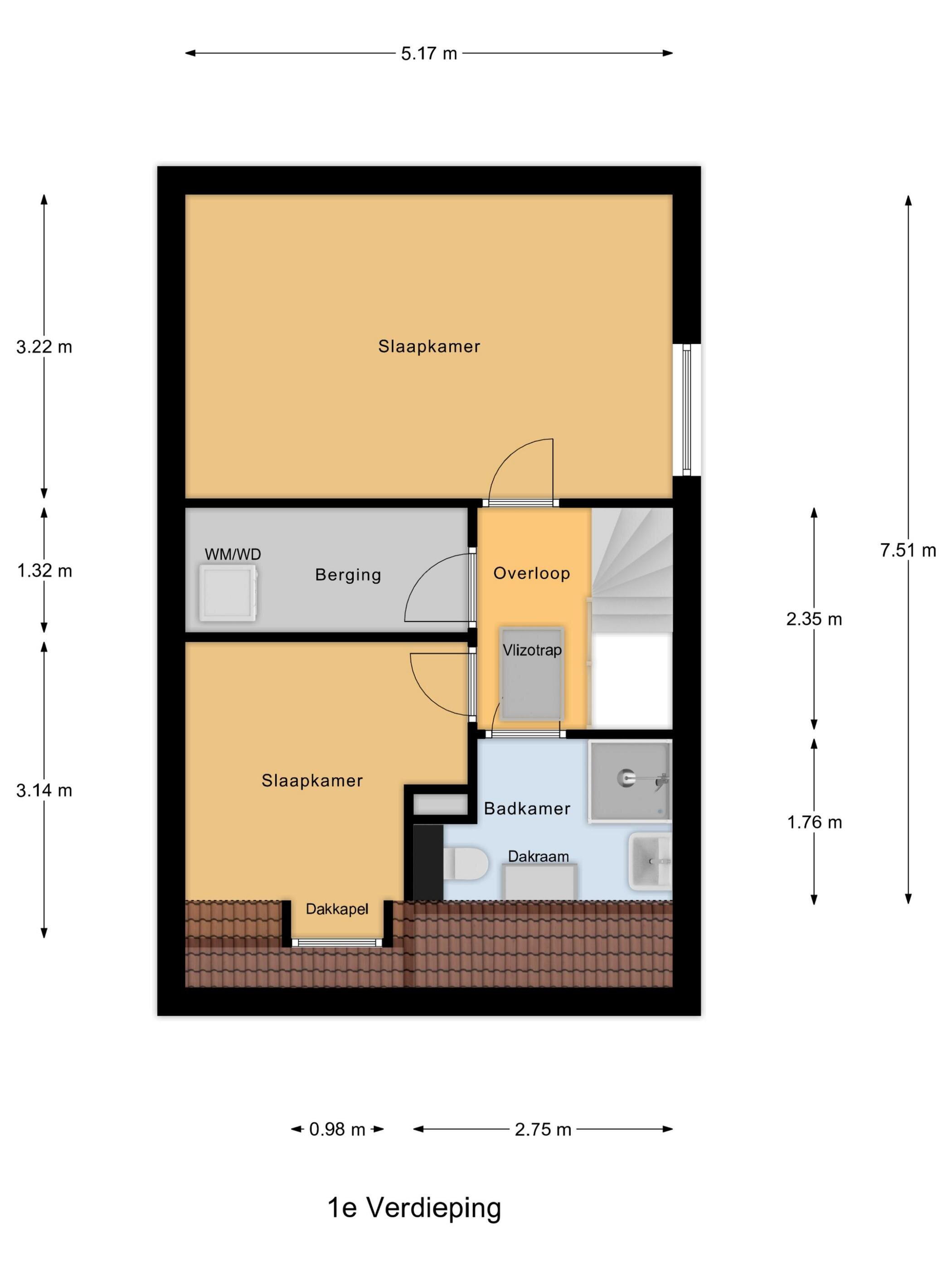 Overloop met toegang tot twee volwaardige slaapkamers (ca. 5,17 x 3,22 m en 3,14 x 2,75 m) en een nette badkamer met douche, wastafel en toilet. De slaapkamers zijn ruim en licht. Verder is er een praktische berging met aansluiting voor witgoed.
