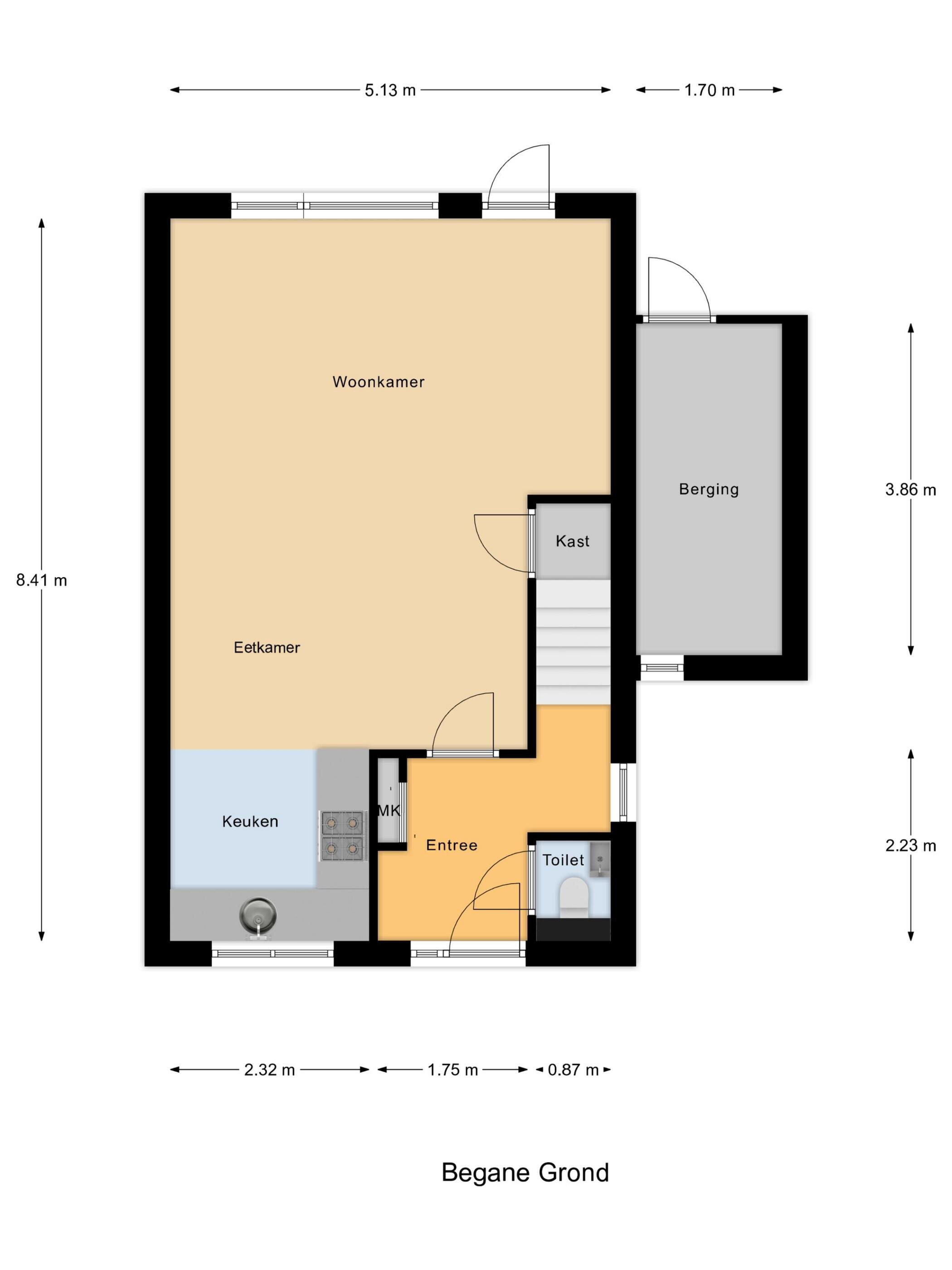 Entree met hal, meterkast, toiletruimte en doorgang naar de ruime en lichte doorzonwoonkamer. Aan de voorzijde bevindt zich de halfopen keuken, voorzien van de nodige inbouwapparatuur. Vanuit de woonkamer heeft u toegang tot de tuin. Tevens is er een inpandige berging met een eigen entree aan de voorzijde.