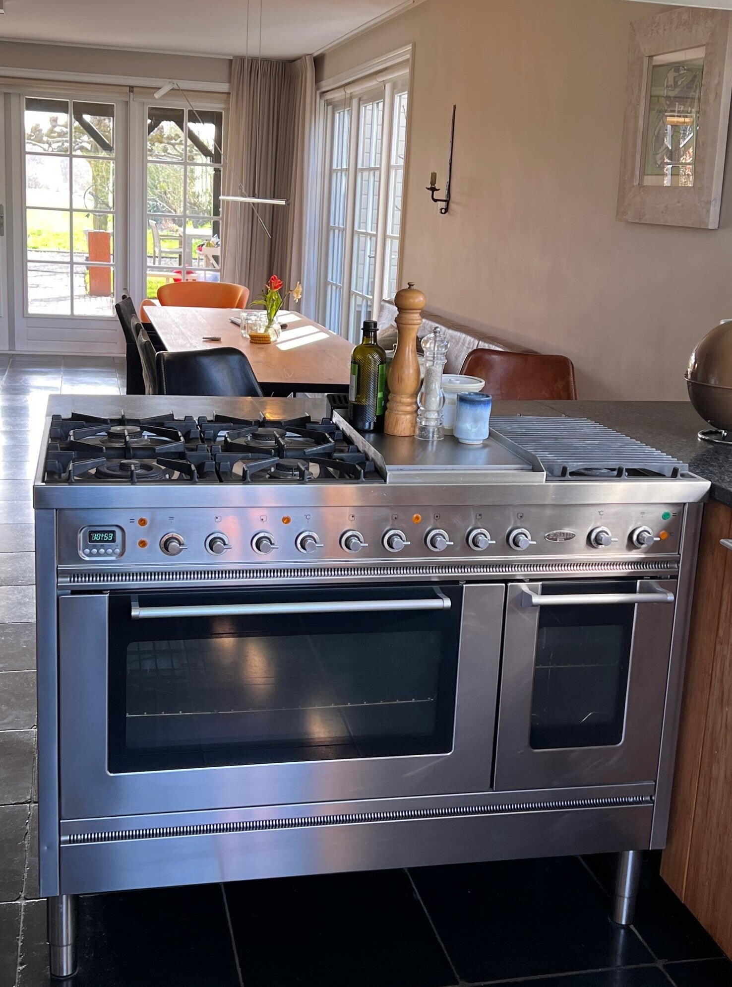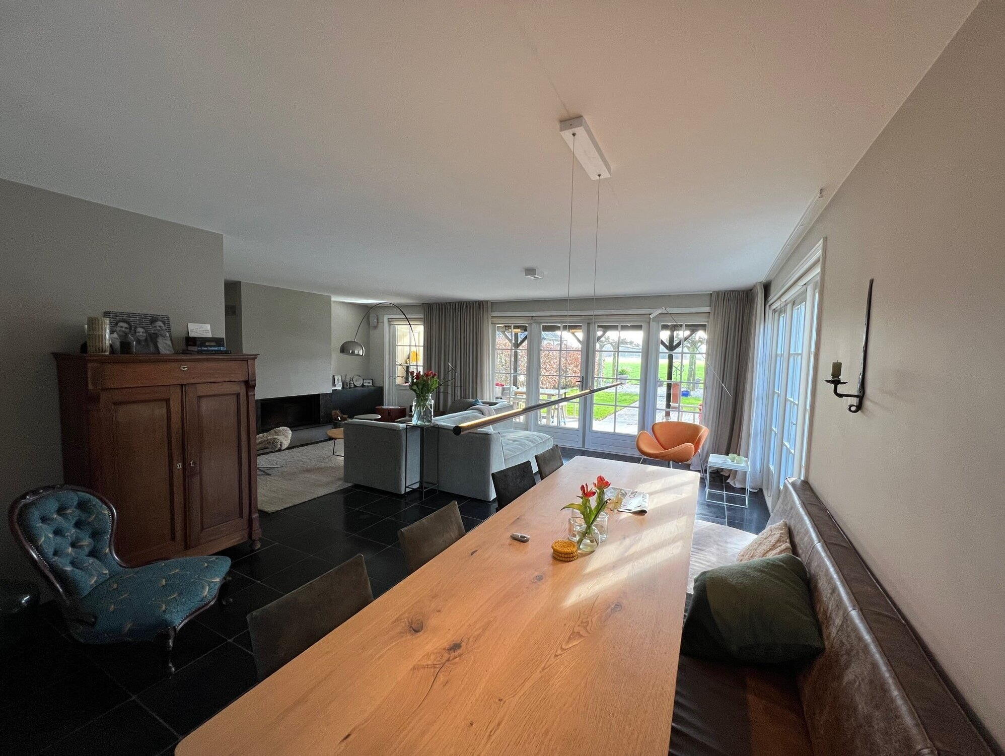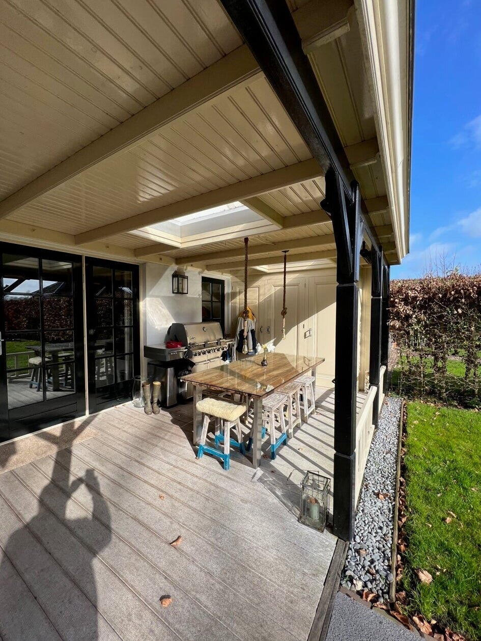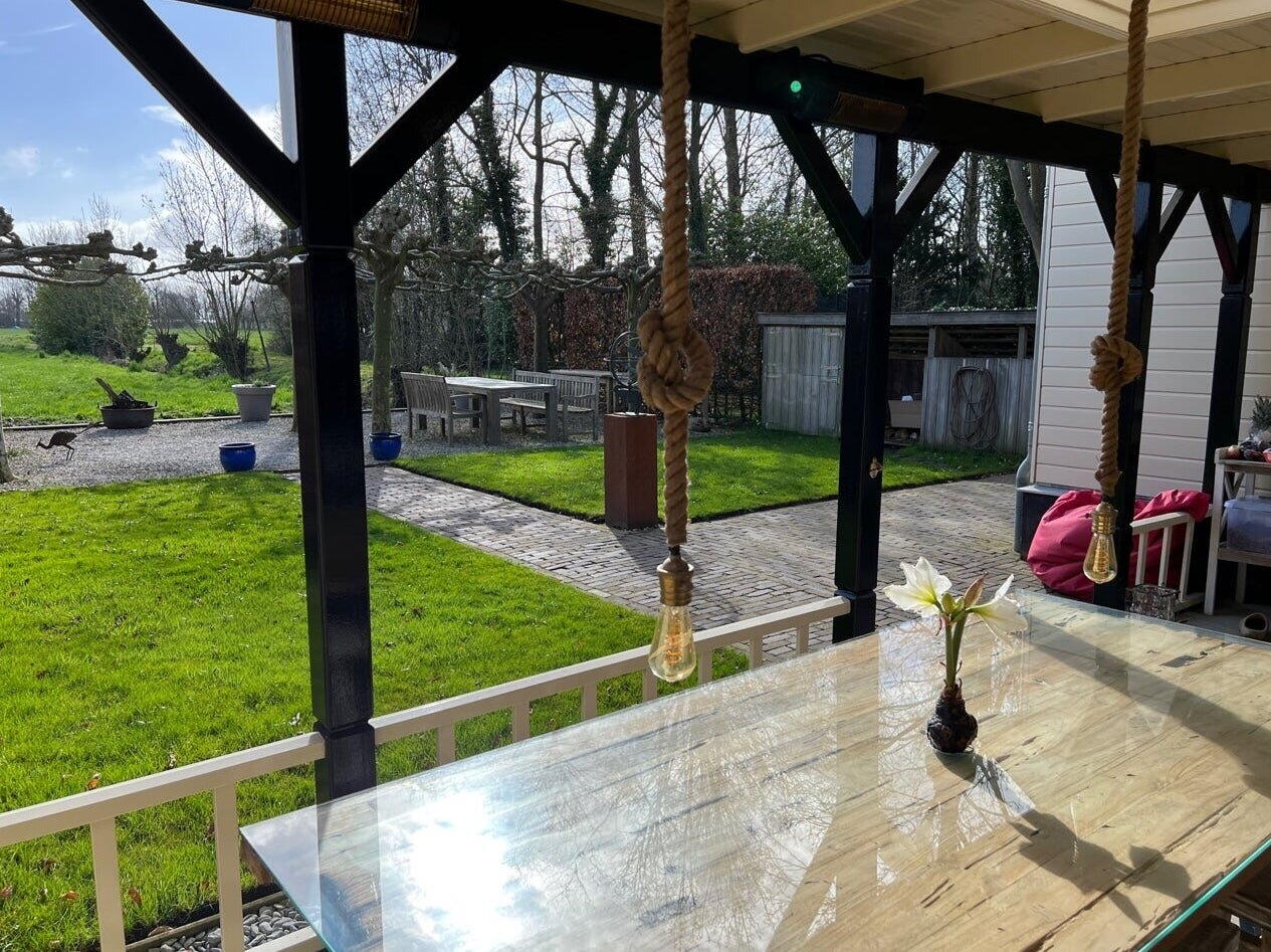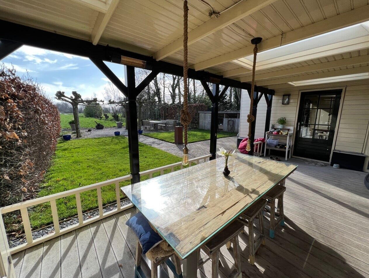 Openslaande deuren naar de ruime tuin voorzien van een knusse luxe veranda met verwarming en een mooie Weber gas barbecue. Het uitzicht over de weilanden is adembenemend en straalt veel rust uit.