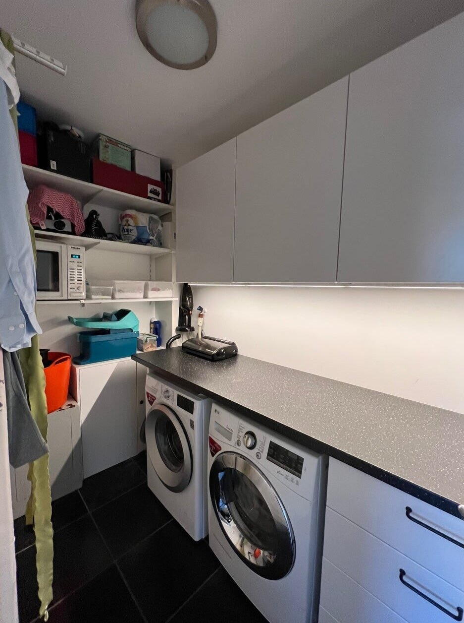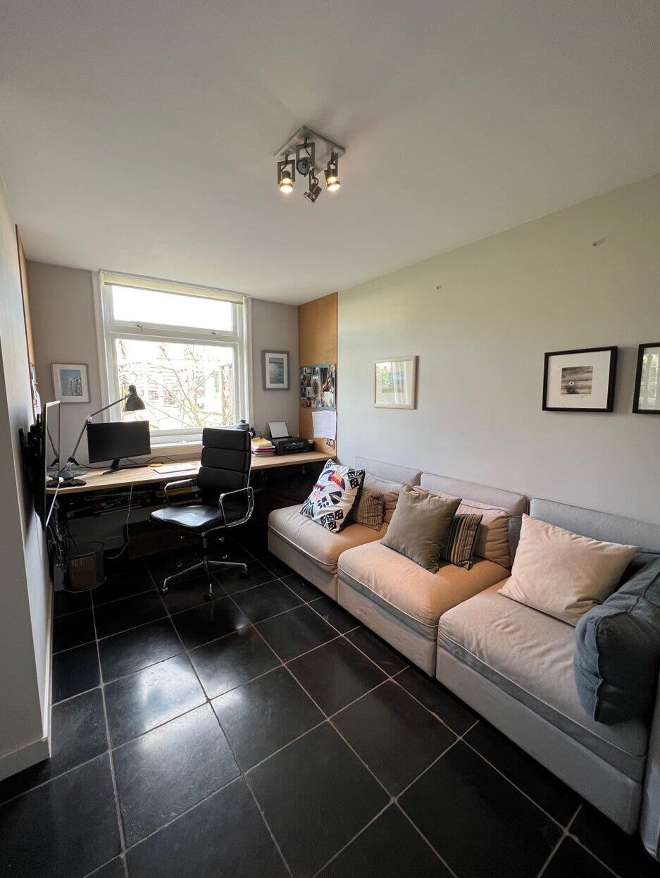 De beneden verdieping heeft tevens een kantoor / slaapkamer, toilet en een ruimte voorzien van wasmachine en droger etc.
