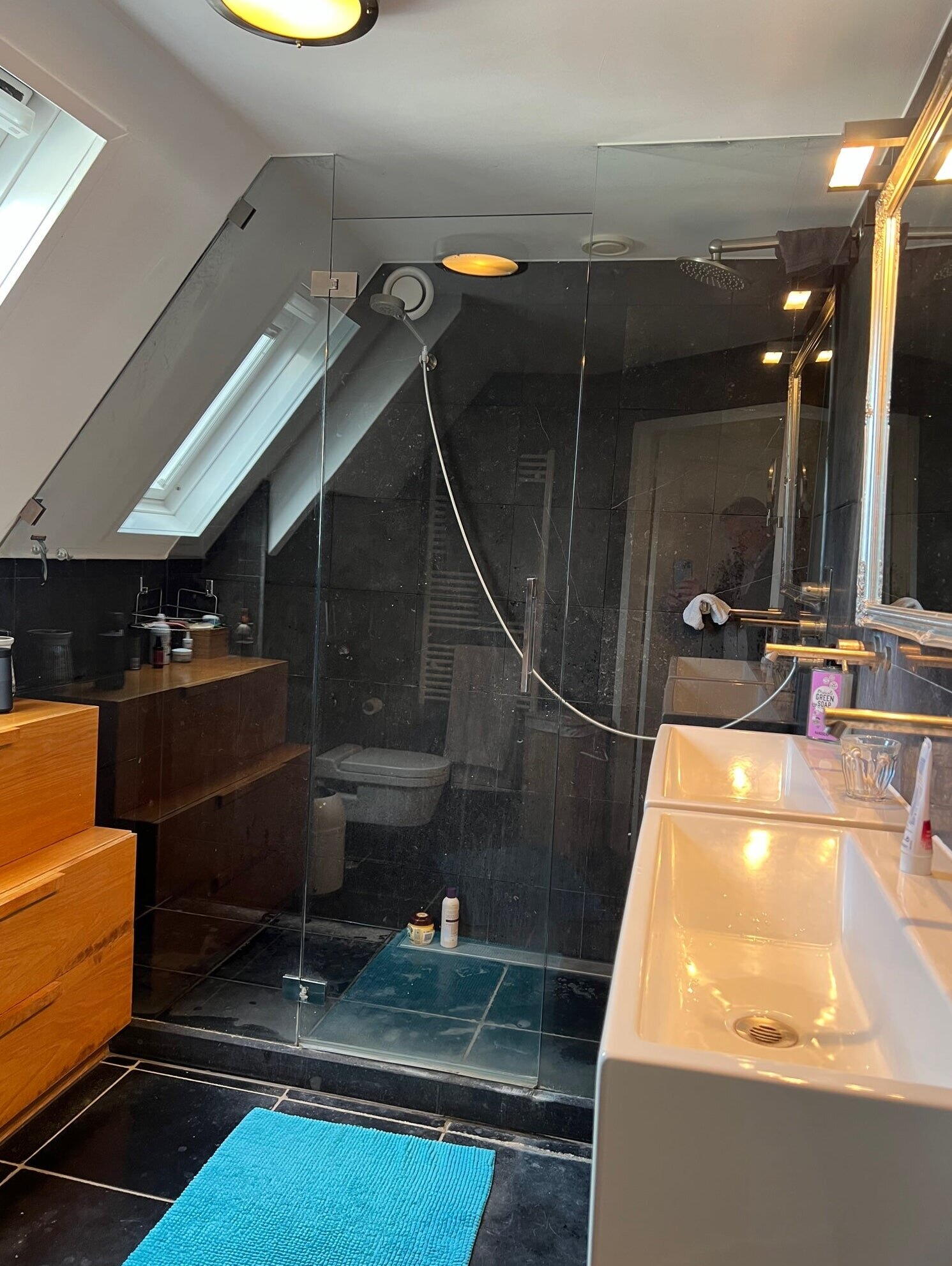 - Dubbele wastafel, toilet, inloopdouche, wastafelmeubel