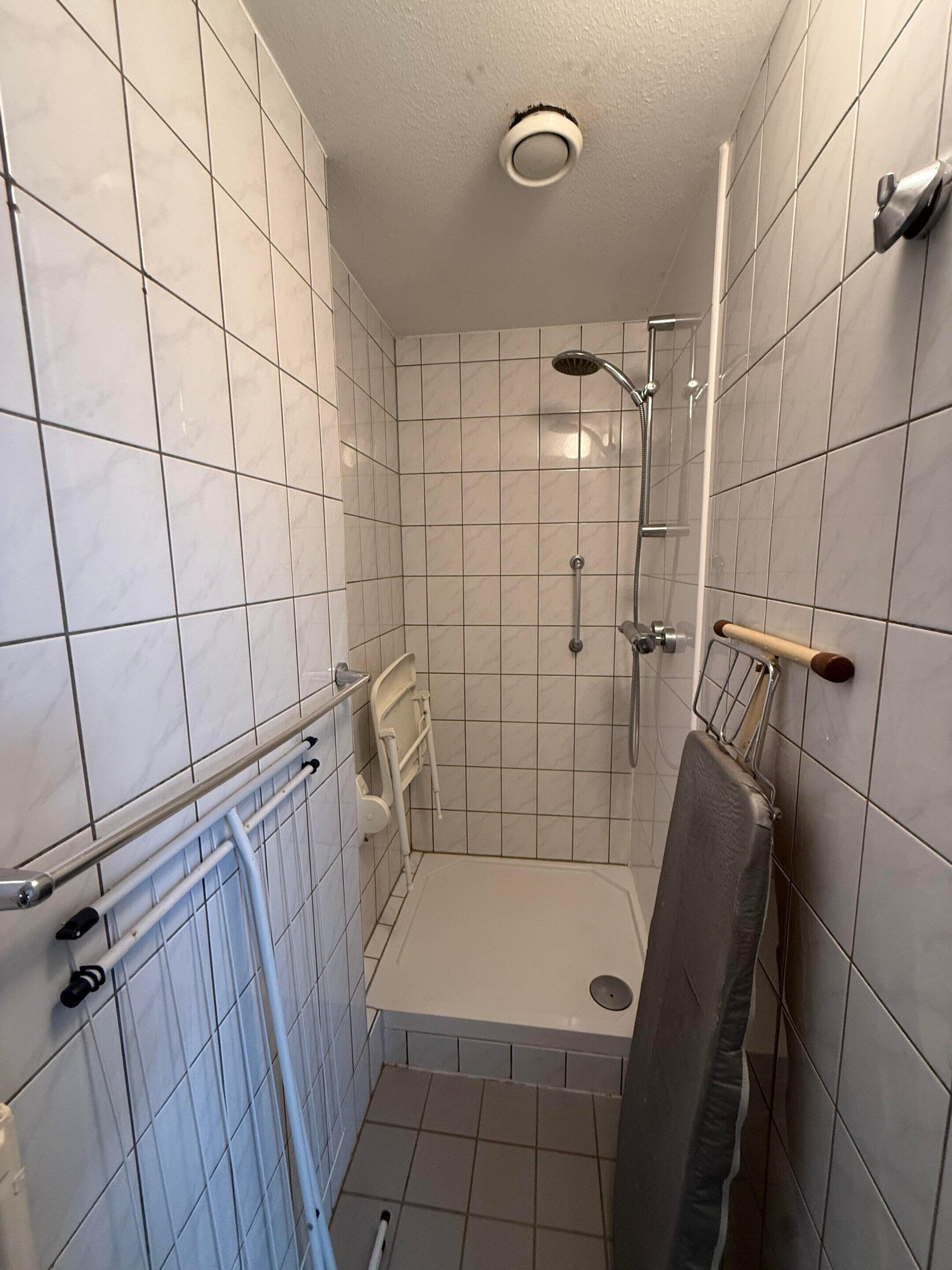 Praktische badkamer met douche (voorzien van zitmogelijkheid), wastafel met spiegel en radiator.