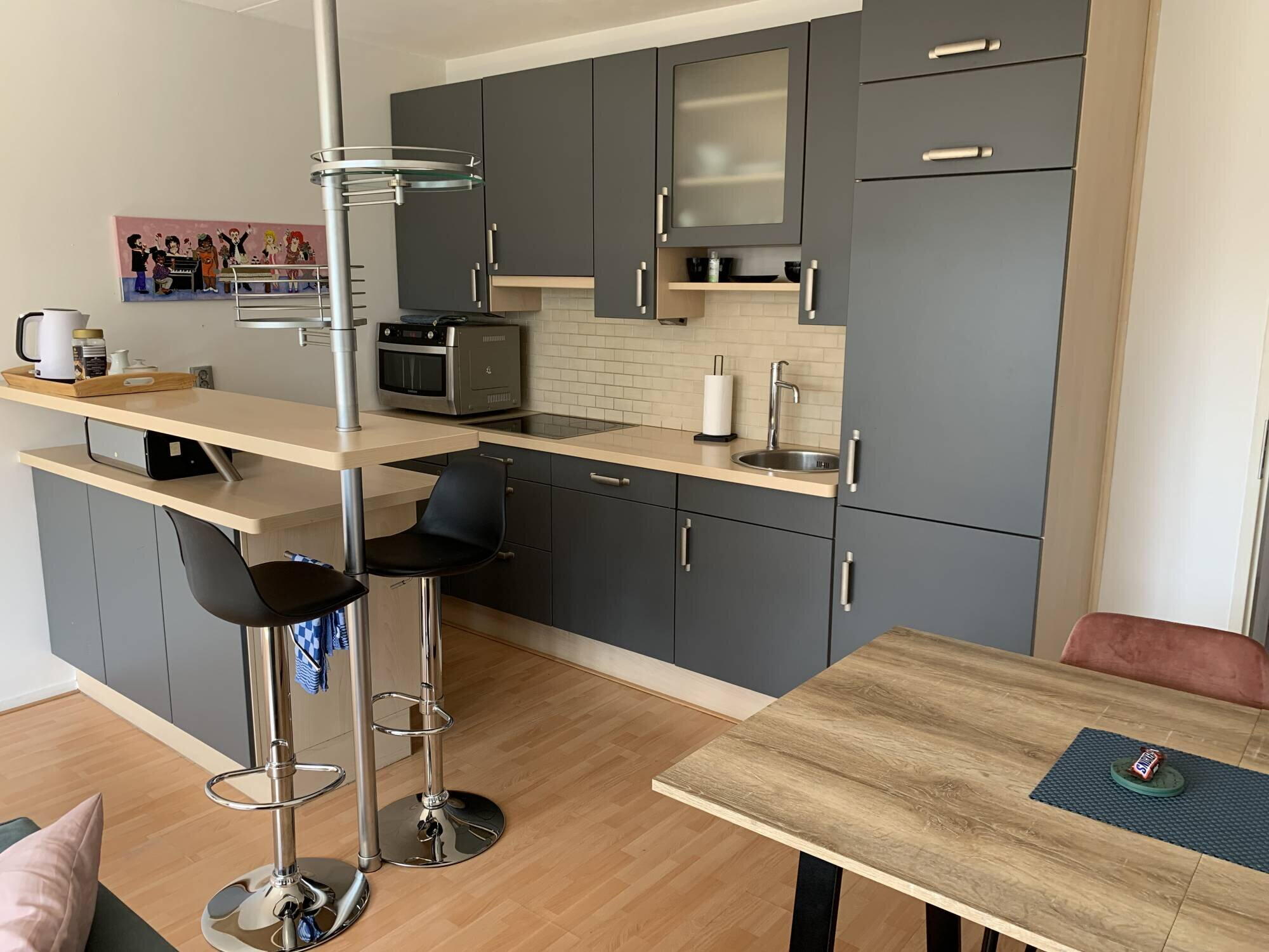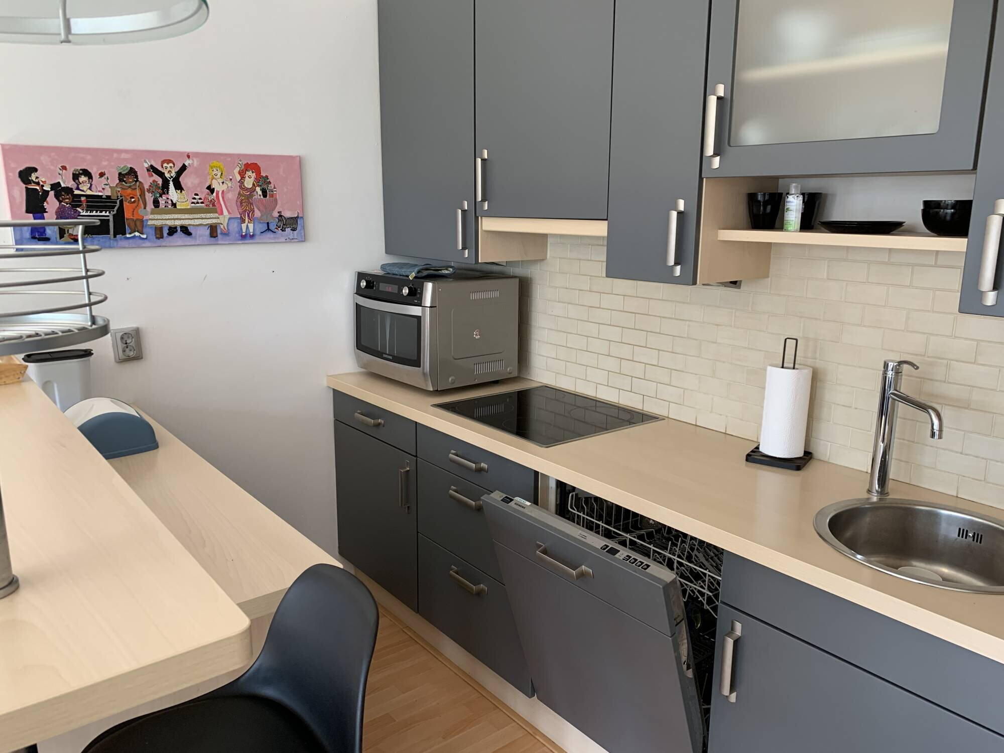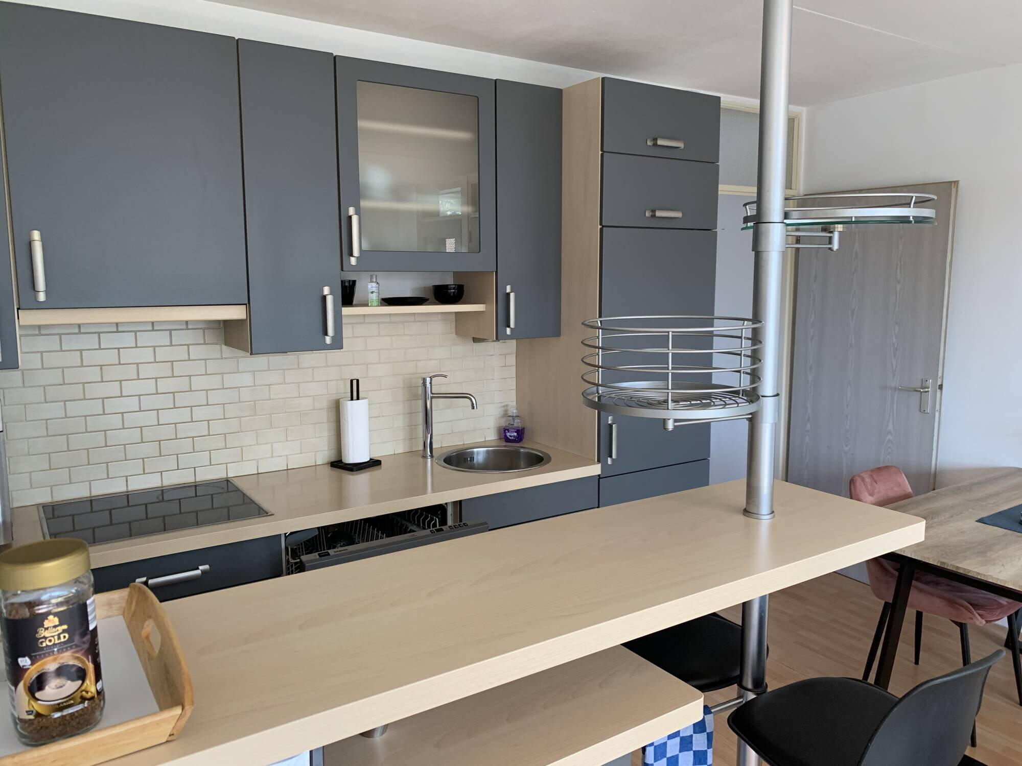 De keuken wordt geleverd met inbouwapparatuur zoals een koelkast, een diepvriezer met 3 laden (bevindt zich onder de koelkast) een inductiekookplaat met afzuiginstallatie en een vaatwasser. De keuken heeft meer dan voldoende kastruimte.