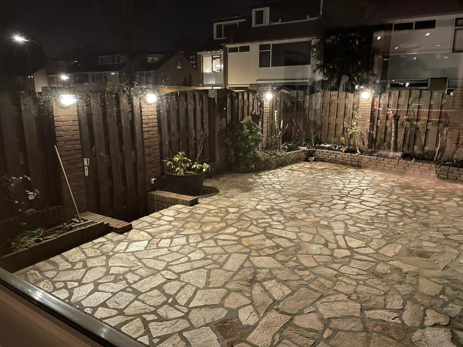 De ruime achtertuin is fraai bestraat. Tevens is er een achterom