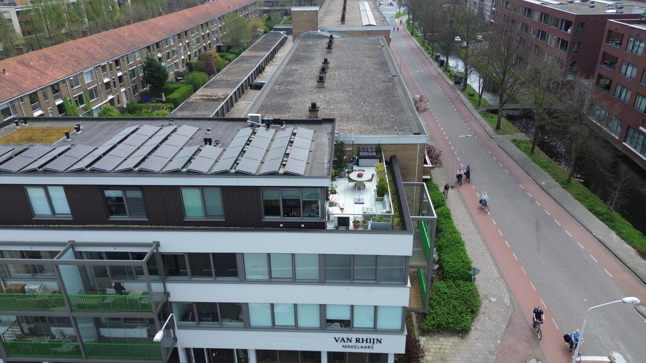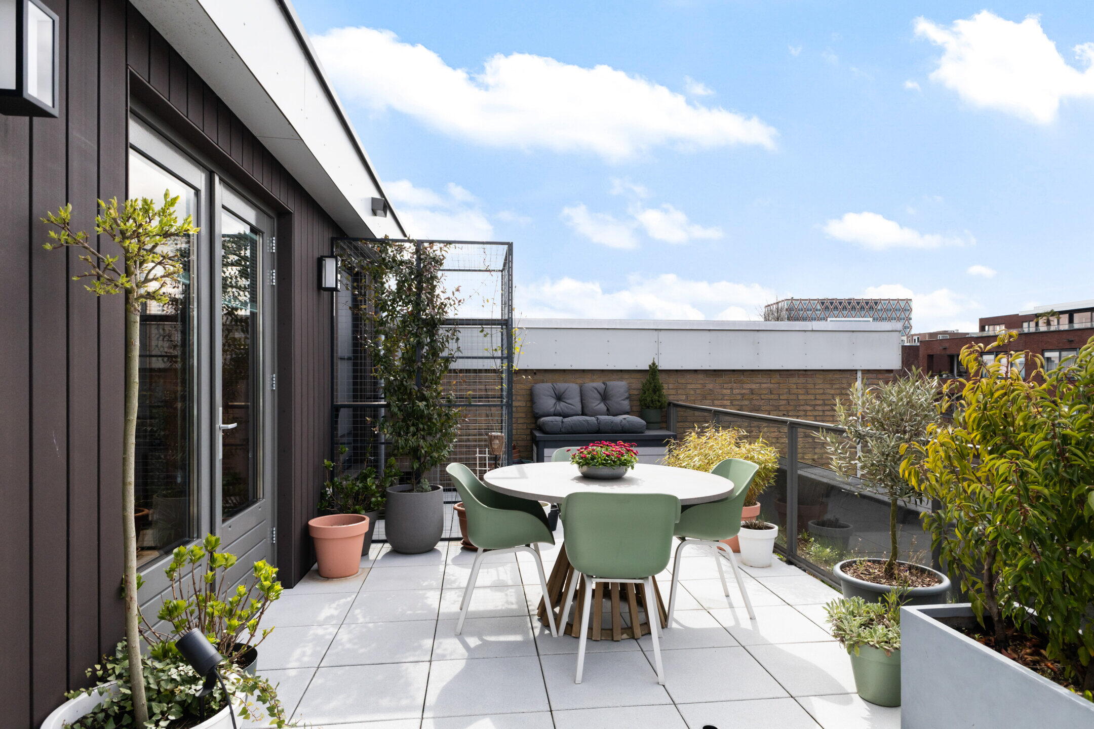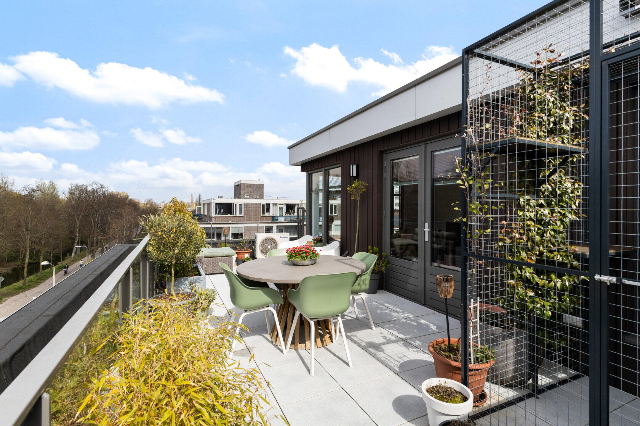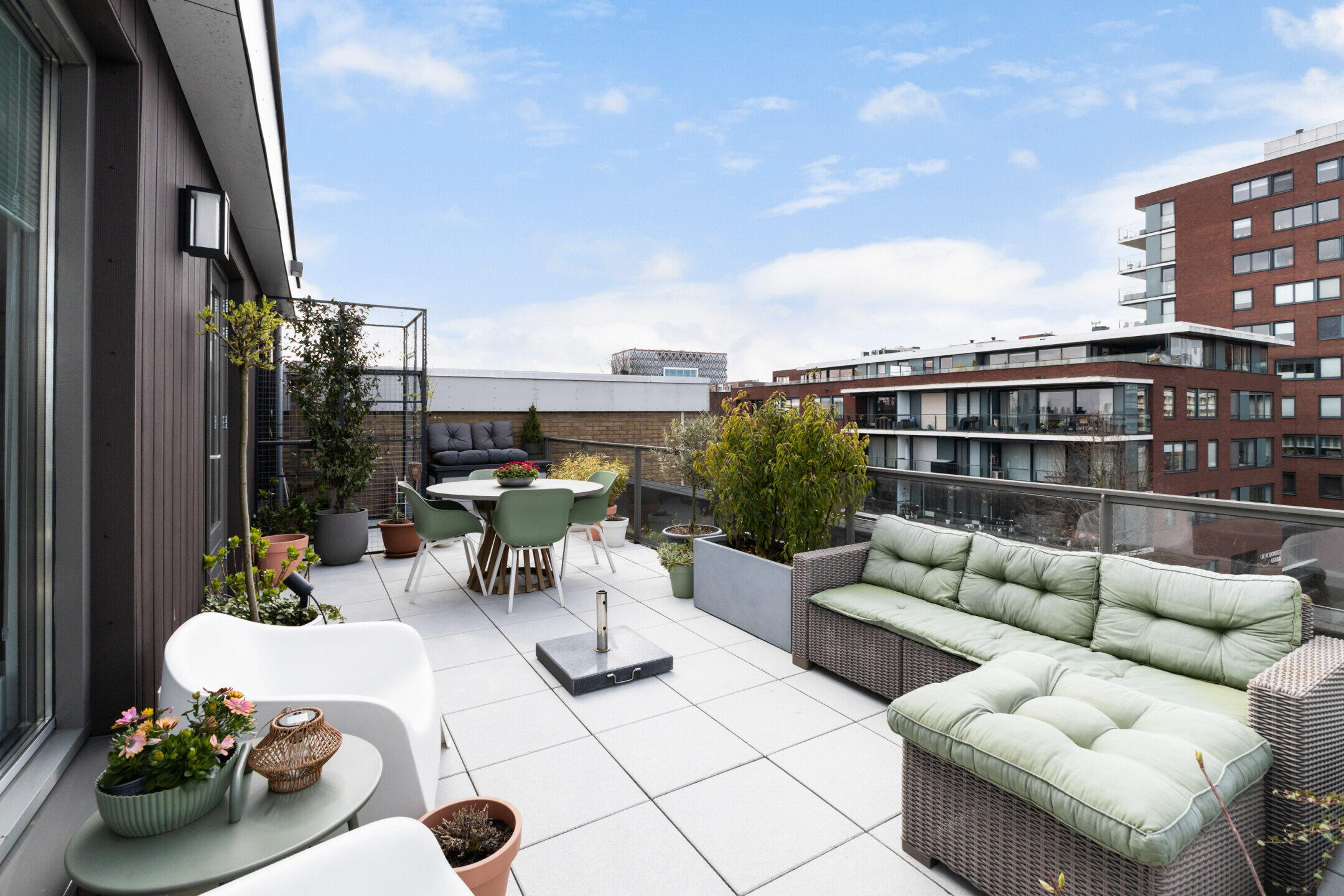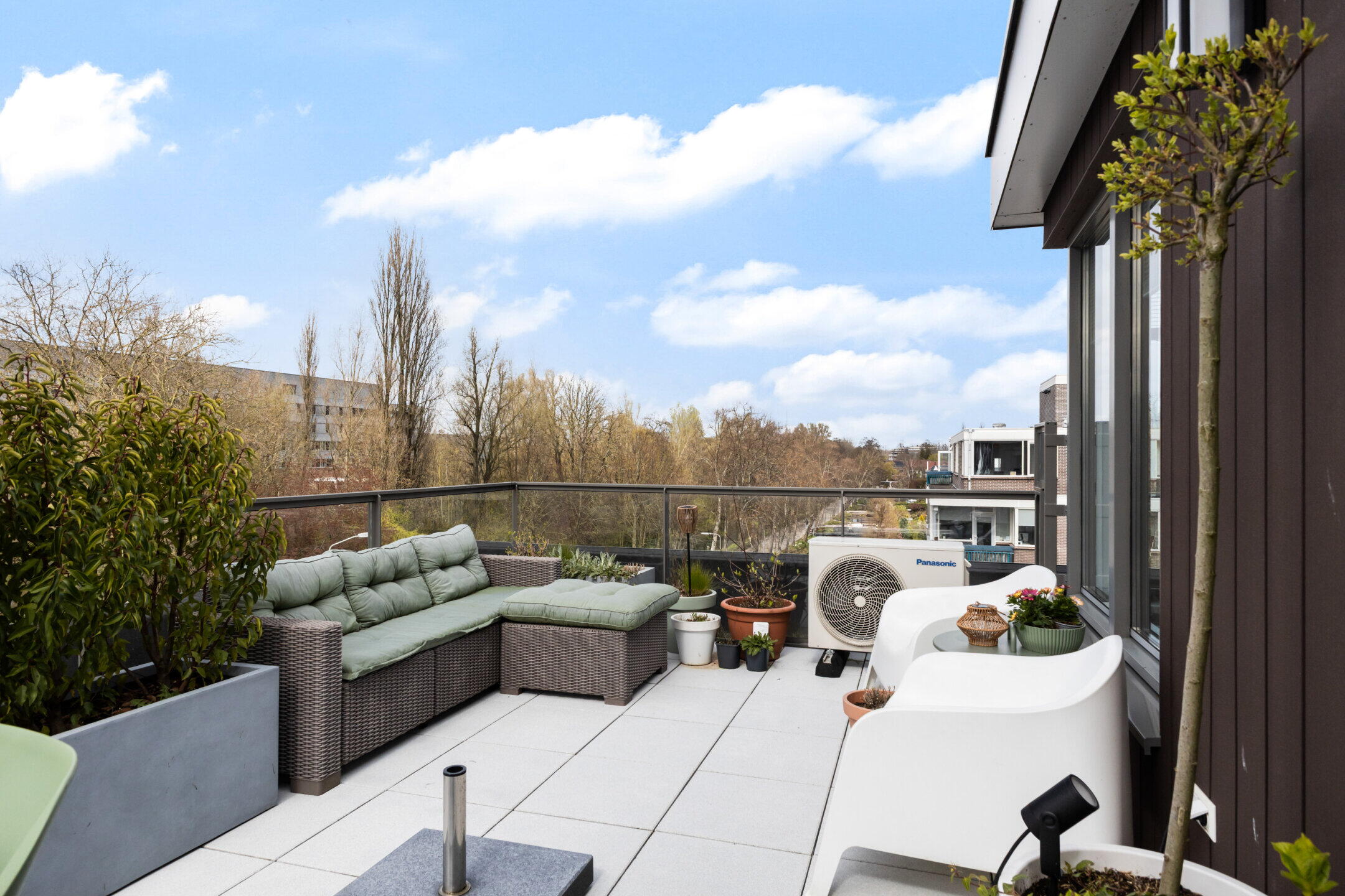 Via de woonkamer stap je het royale en zonnige dakterras op van ca. 26,6 m², waar je een groot deel van de dag kunt genieten van de zon en het uitzicht.