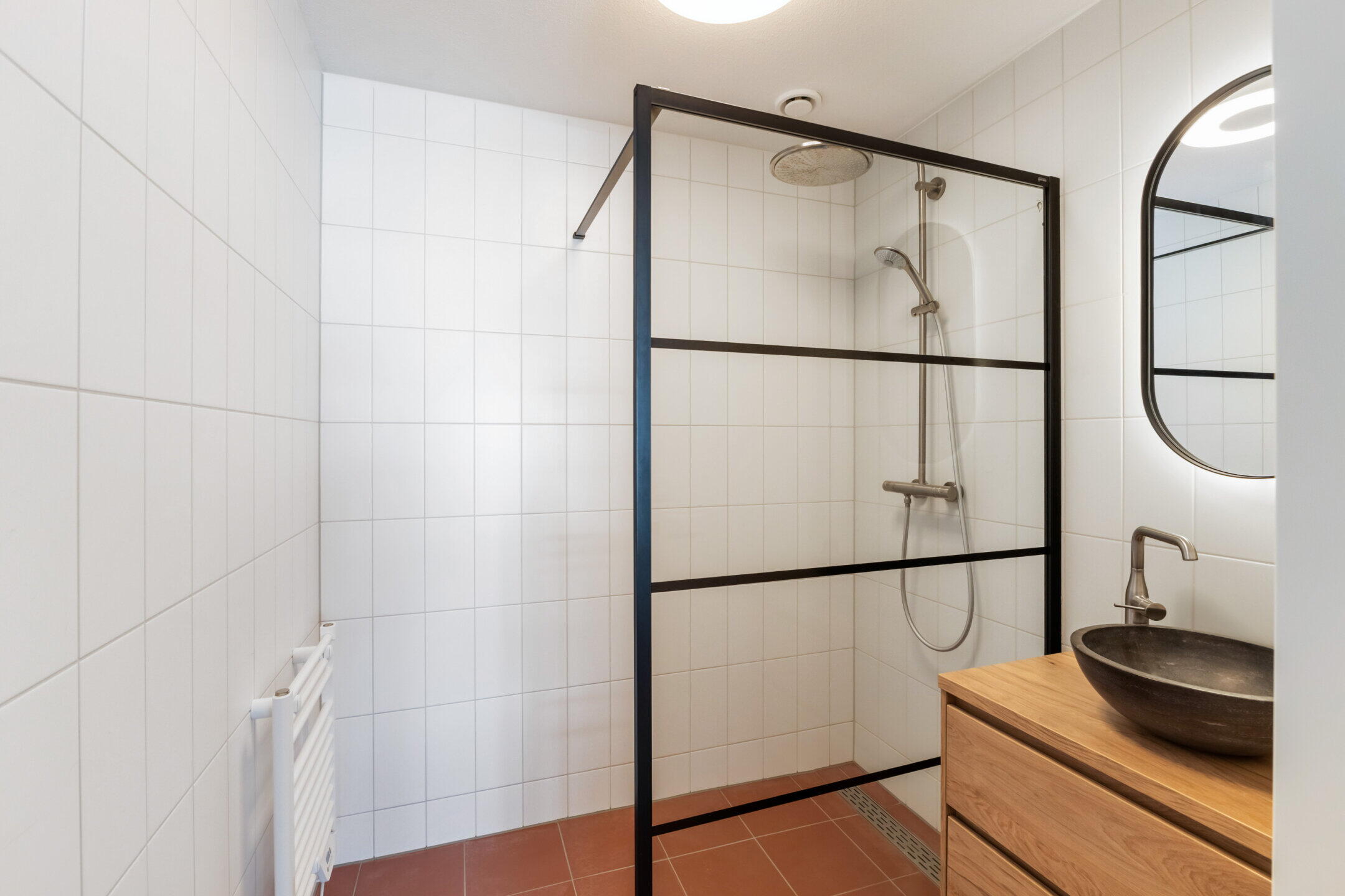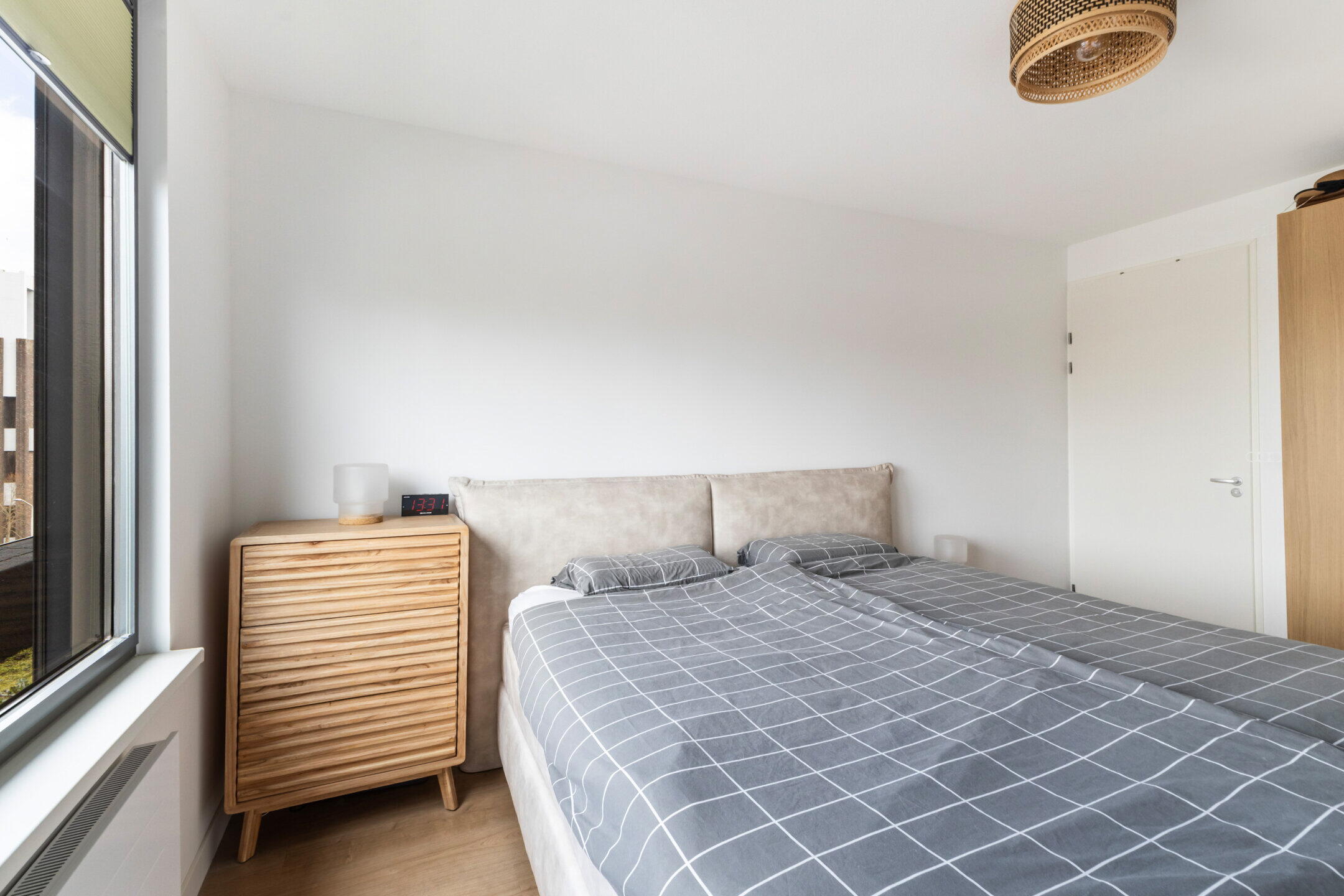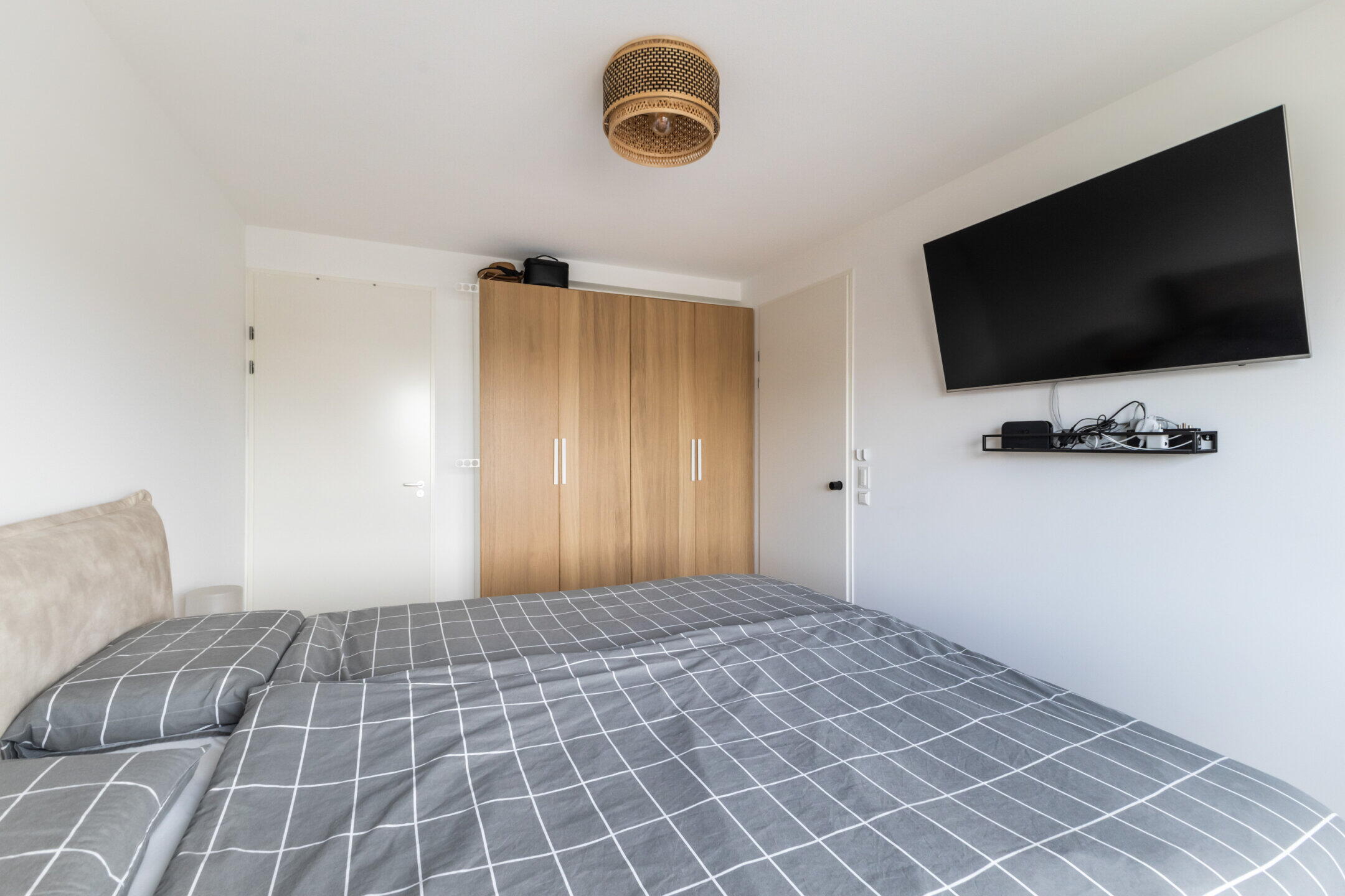 Slaapkamer (1) van ca. 15,6 m² is voorzien van een nette laminaatvloer, strakke afwerking én airco. Vanuit deze kamer heb je direct toegang tot de moderne badkamer met douchecabine, wastafelmeubel en handdoekradiator.