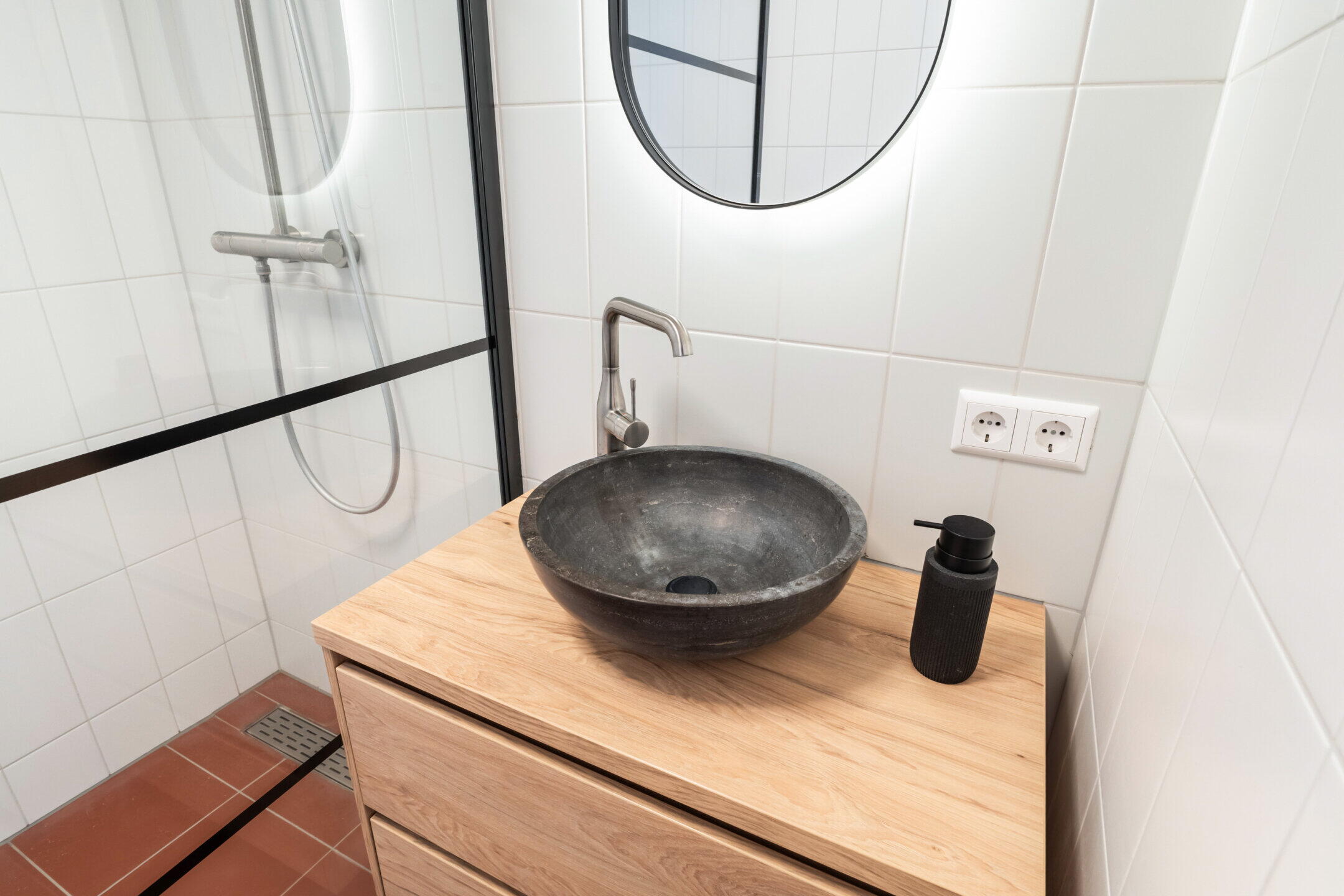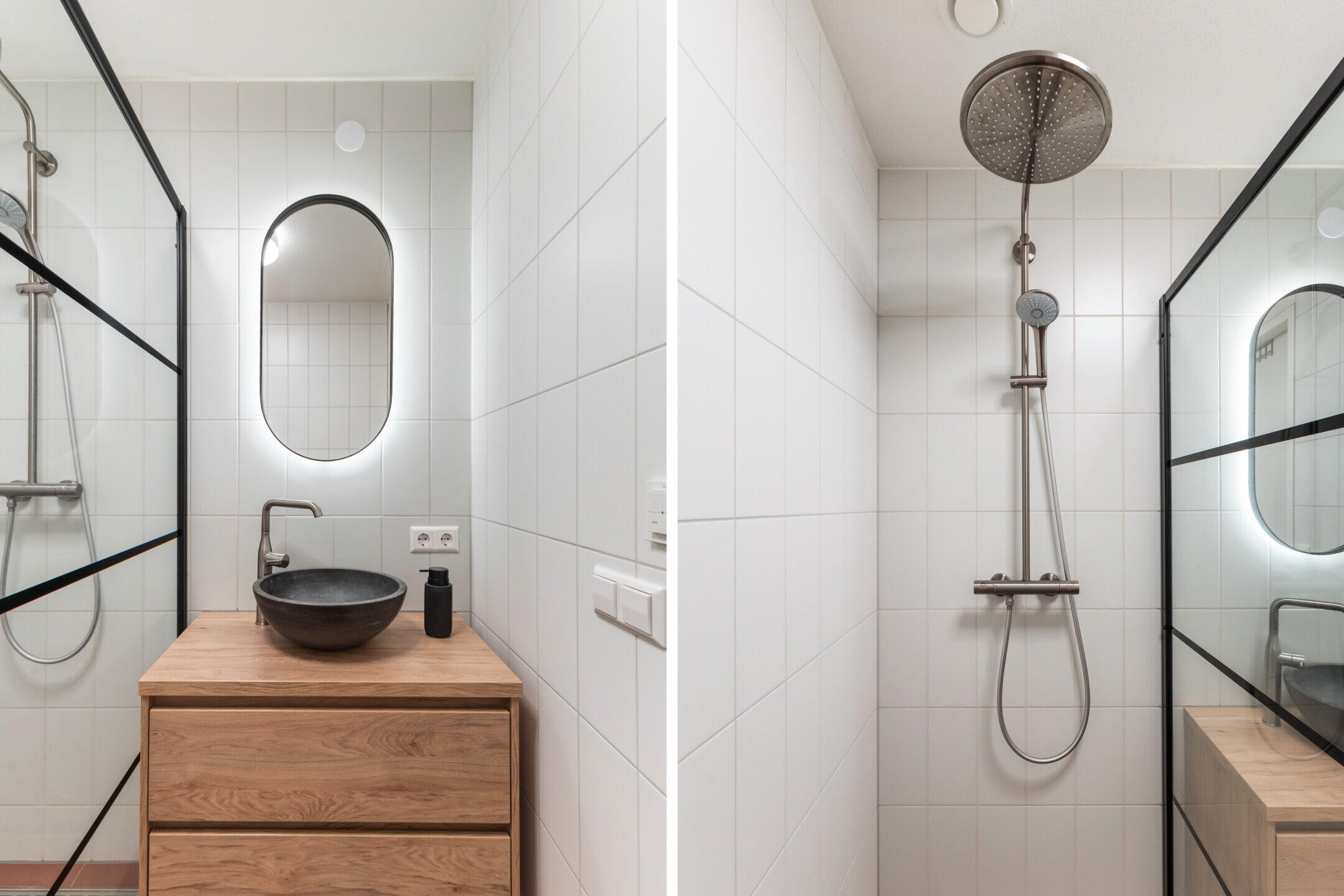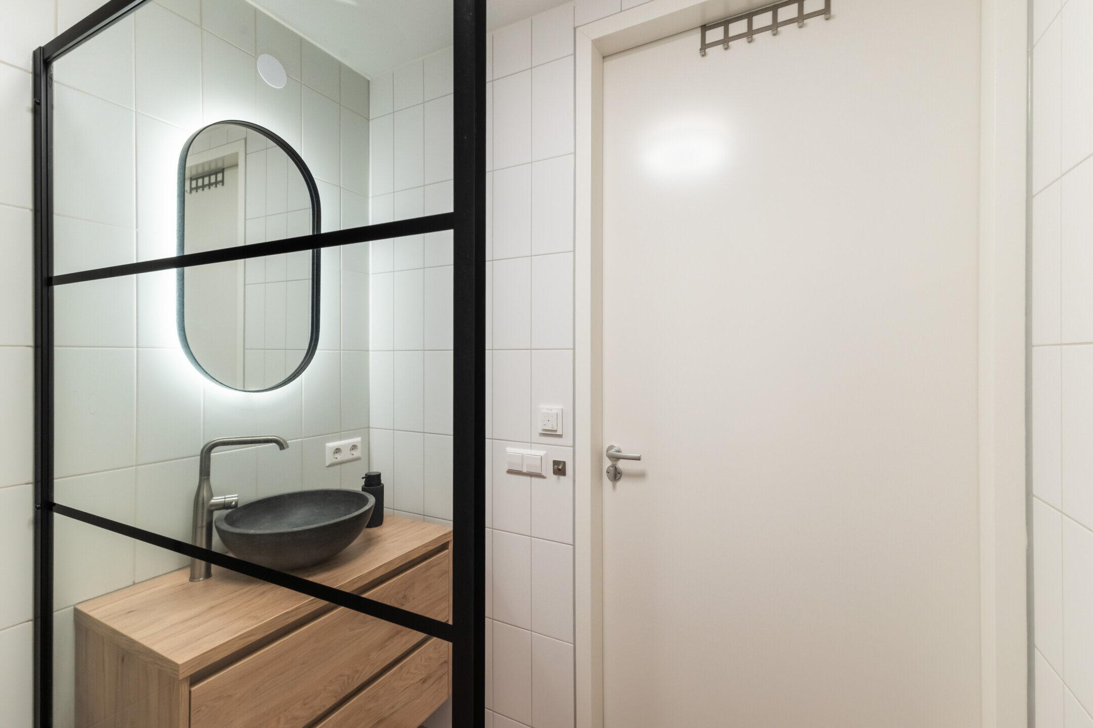 Slaapkamer (1) van ca. 15,6 m² is voorzien van een nette laminaatvloer, strakke afwerking én airco. Vanuit deze kamer heb je direct toegang tot de moderne badkamer met douchecabine, wastafelmeubel en handdoekradiator.