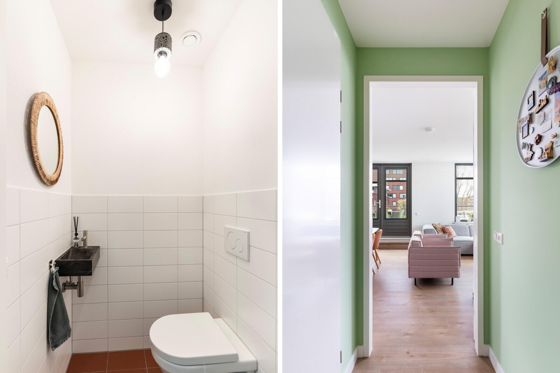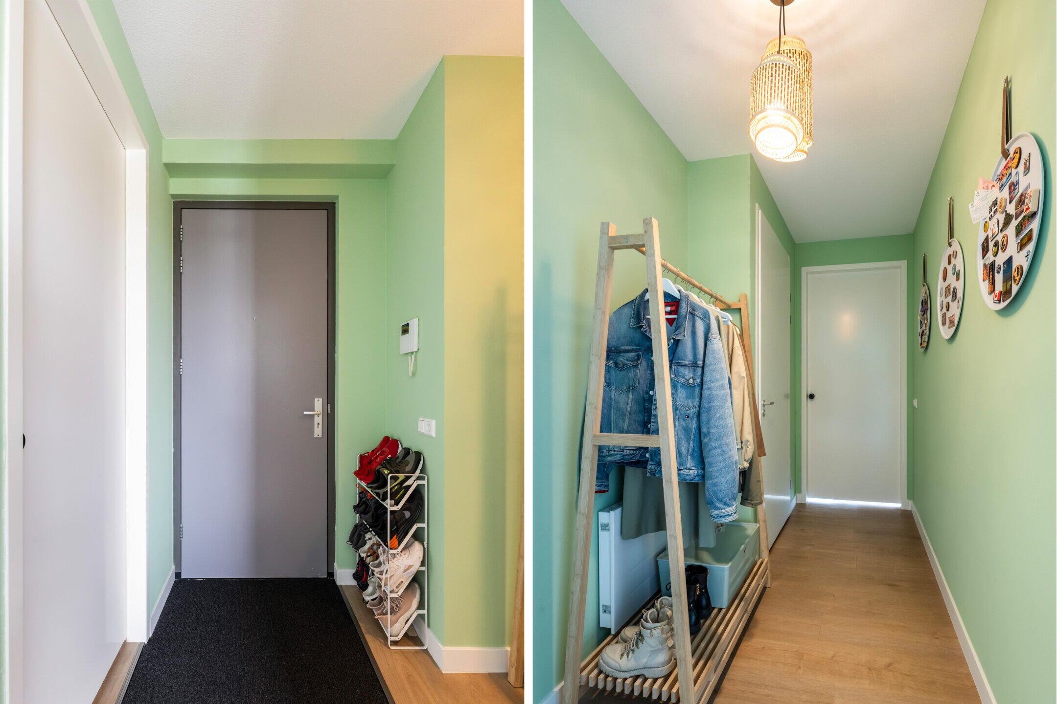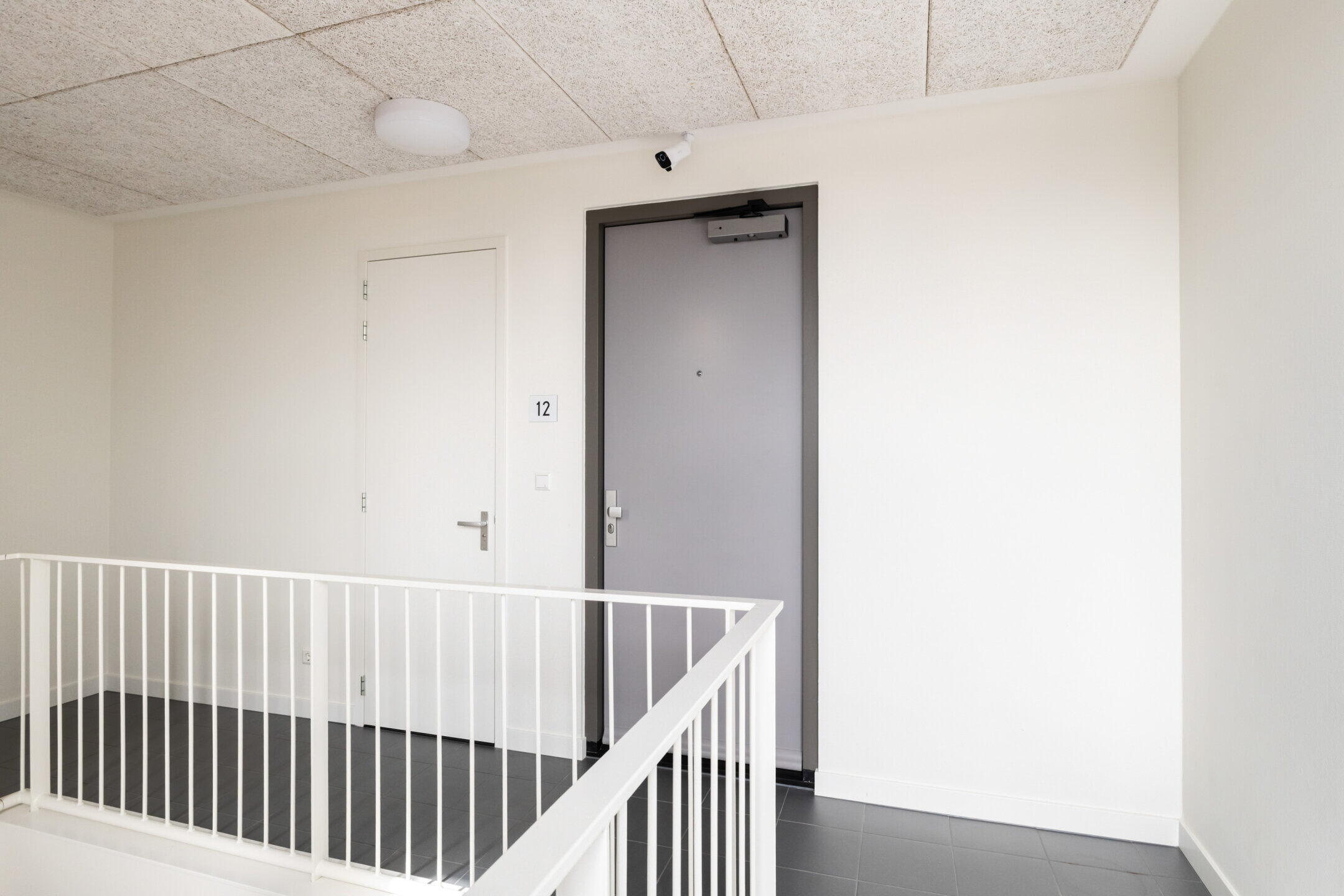 Via de gezamenlijke entree ga je via de trap naar de entree van nummer 12. Je komt binnen in de hal met de meterkast, het toilet en toegang tot alle vertrekken.